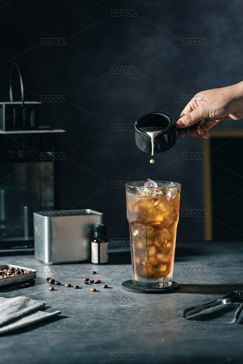往放水泥台面上装满冰咖啡的玻璃杯里倒牛奶