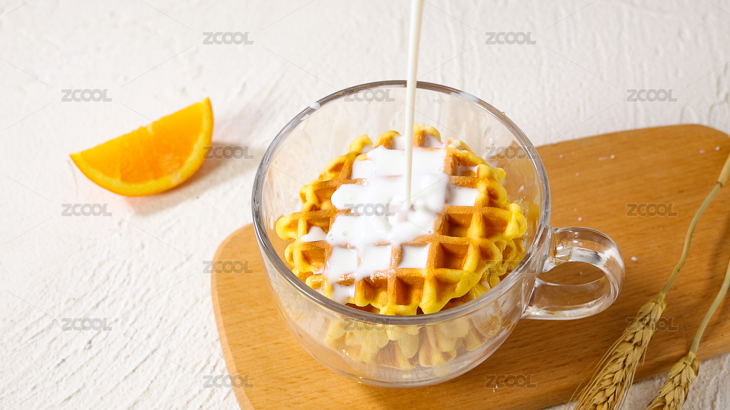 白色带纹理背景中往华夫饼干上倒牛奶