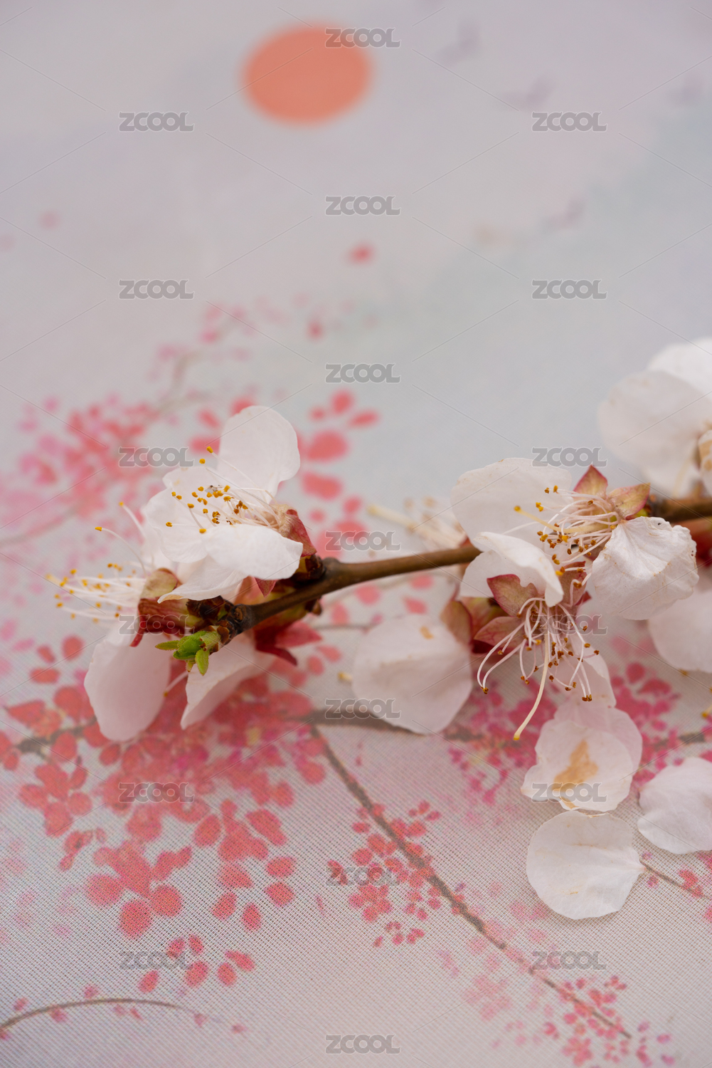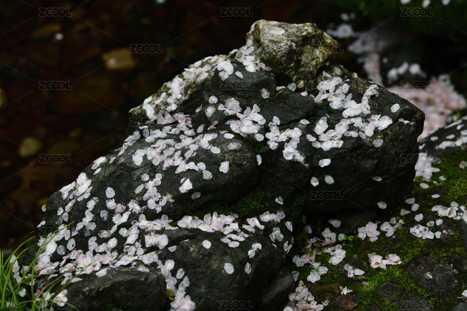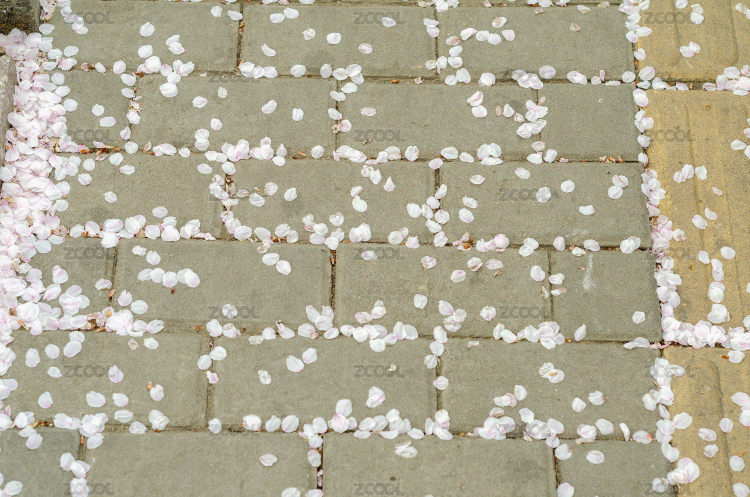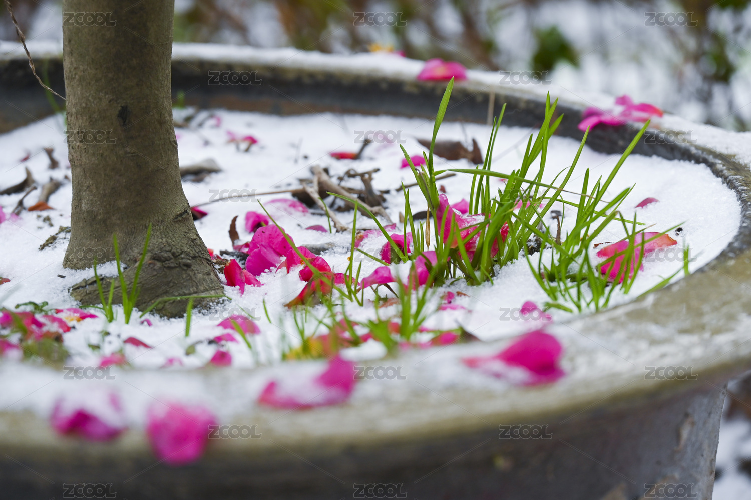 洁白的大雪映衬着的玫红色鲜艳落花花瓣