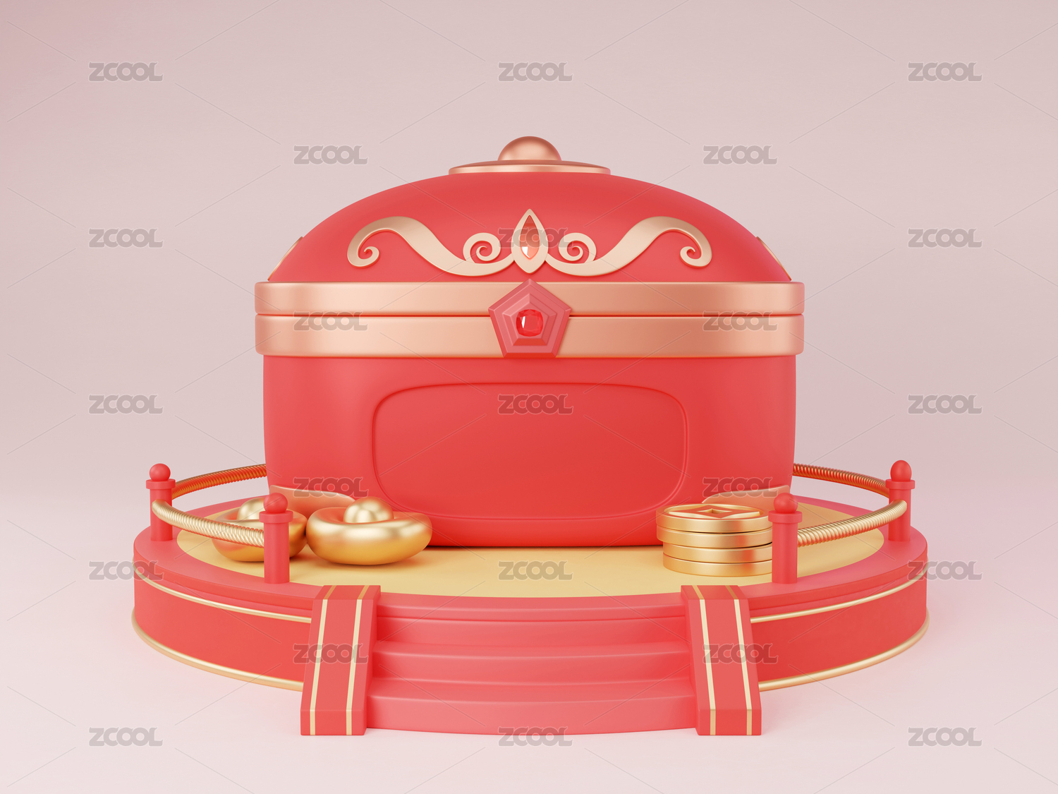 红色吉祥纹理的宝箱盒子放在喜庆的台子上
