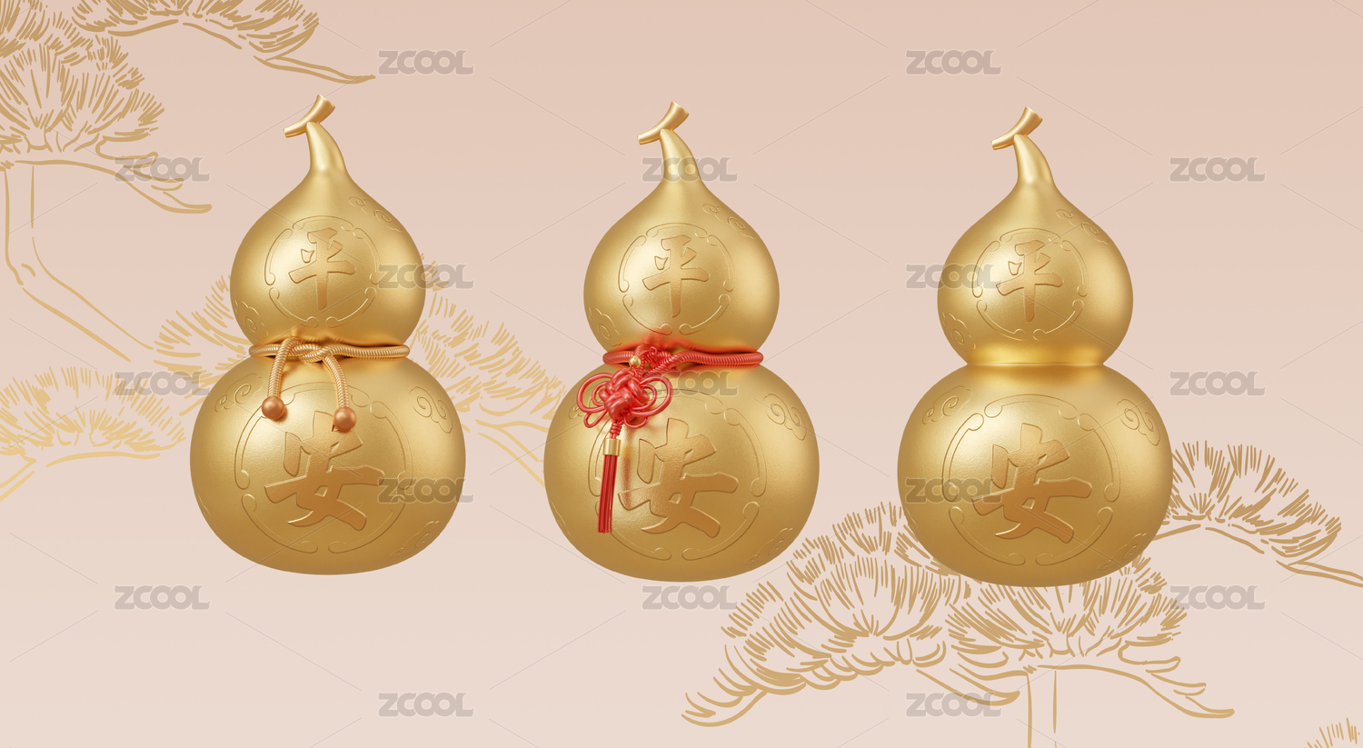 红色布纹背景吉祥如意宝字金色3D葫芦