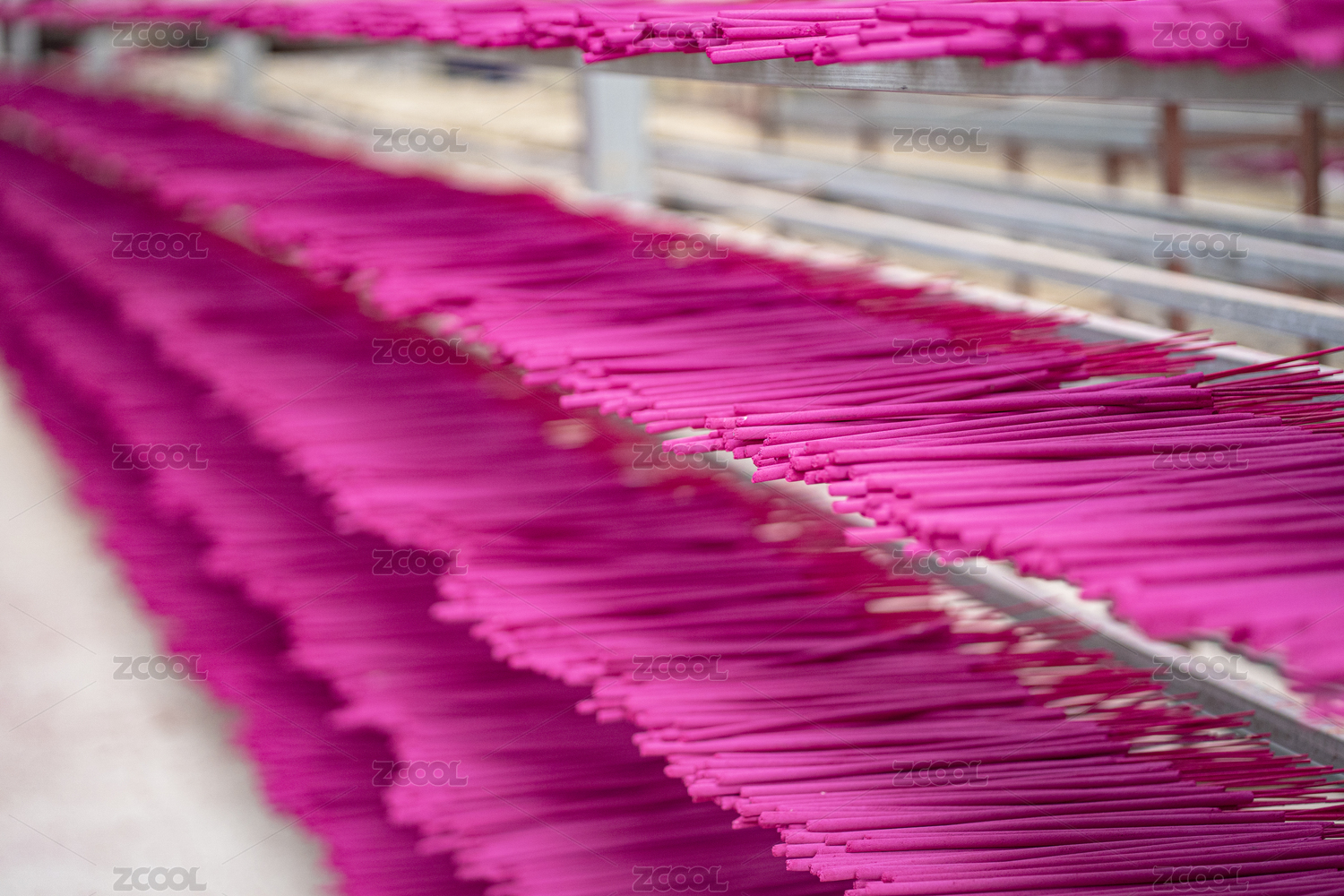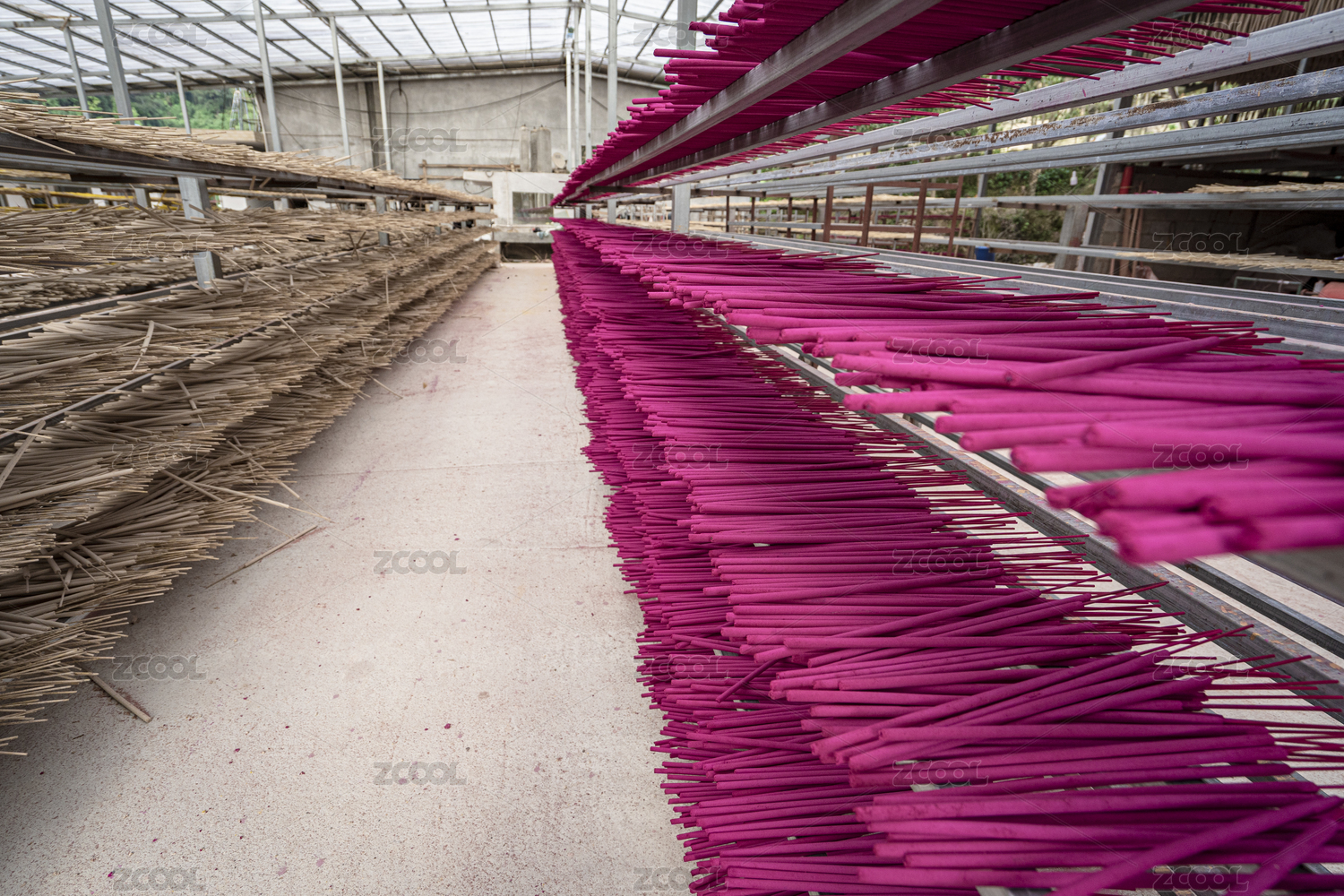 工厂里货架上摆放晾晒的供香半成品