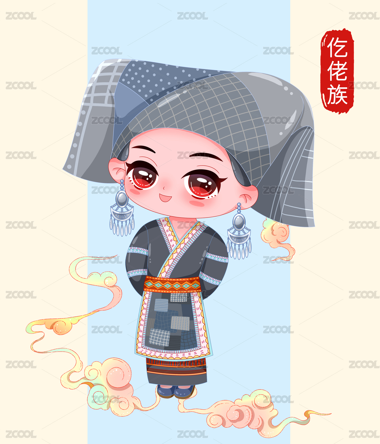 中国五十六个民族少女盛装女性服饰牡丹花丝带插画