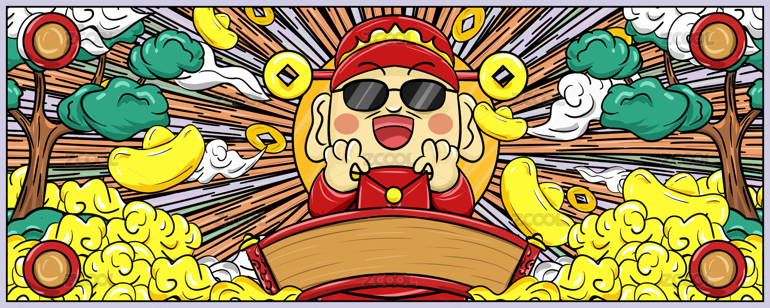 迎财神恭喜发财手绘插画