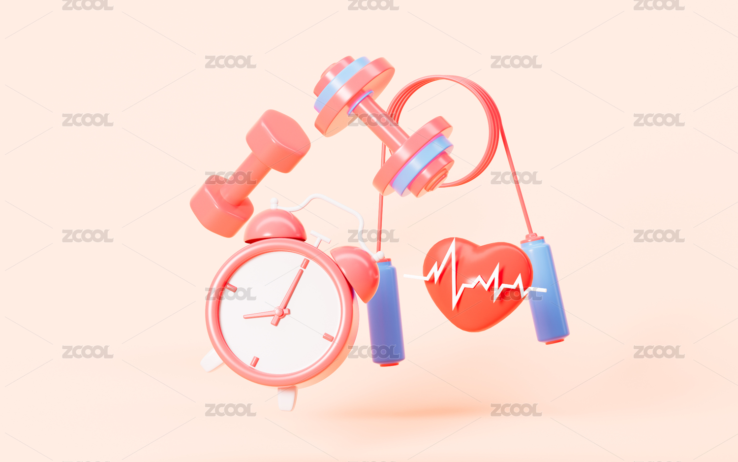 卡通哑铃跳绳等健身工具3D渲染