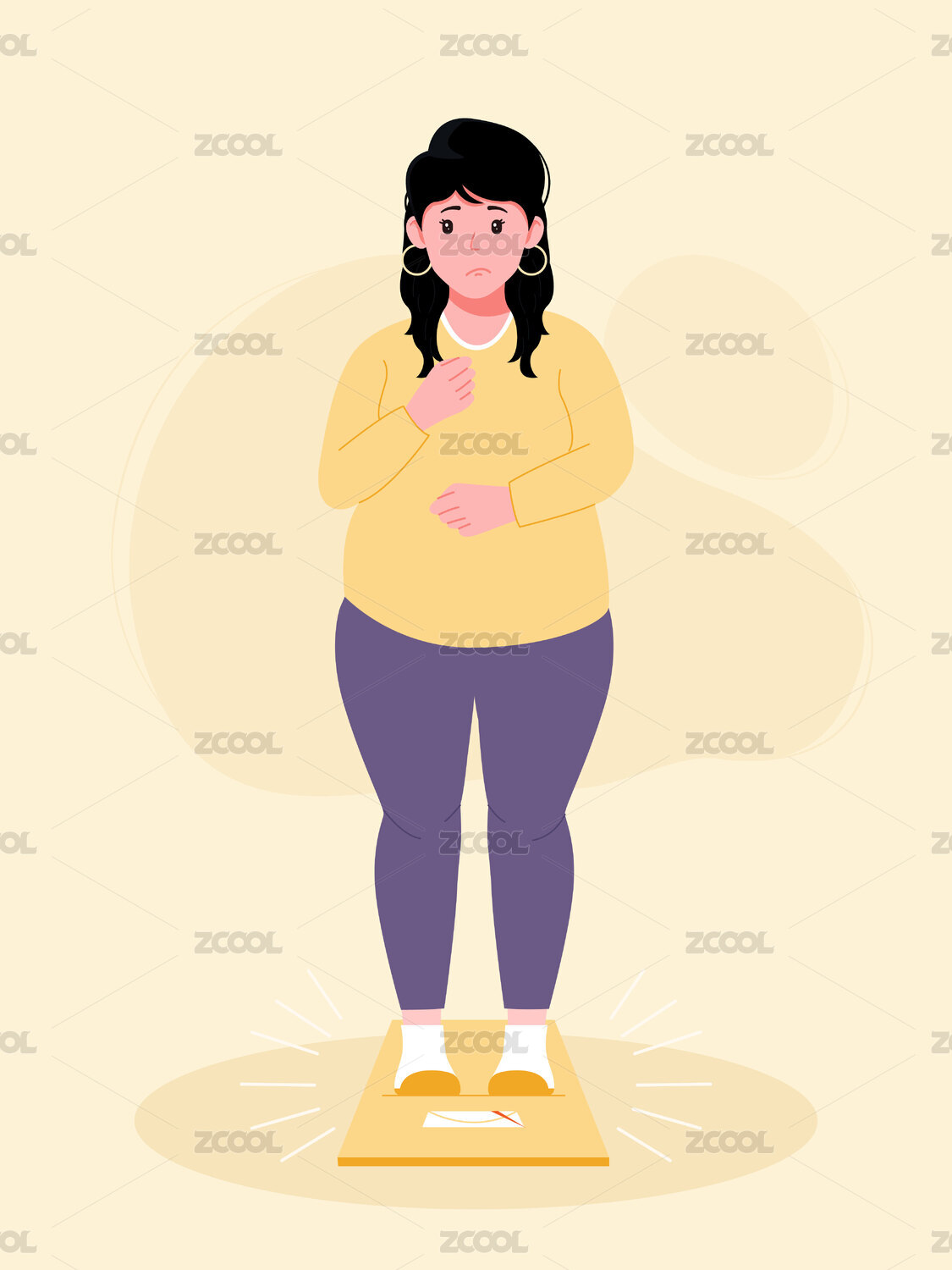 一个肥胖的女生站在体重计上面矢量插画
