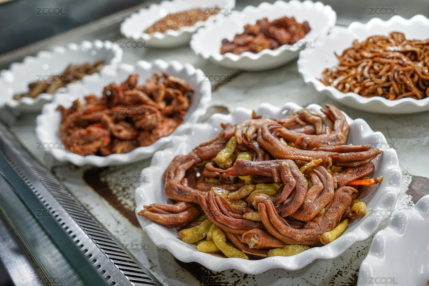 自助餐厅里美味的卤鸭掌盛放在白瓷盘内