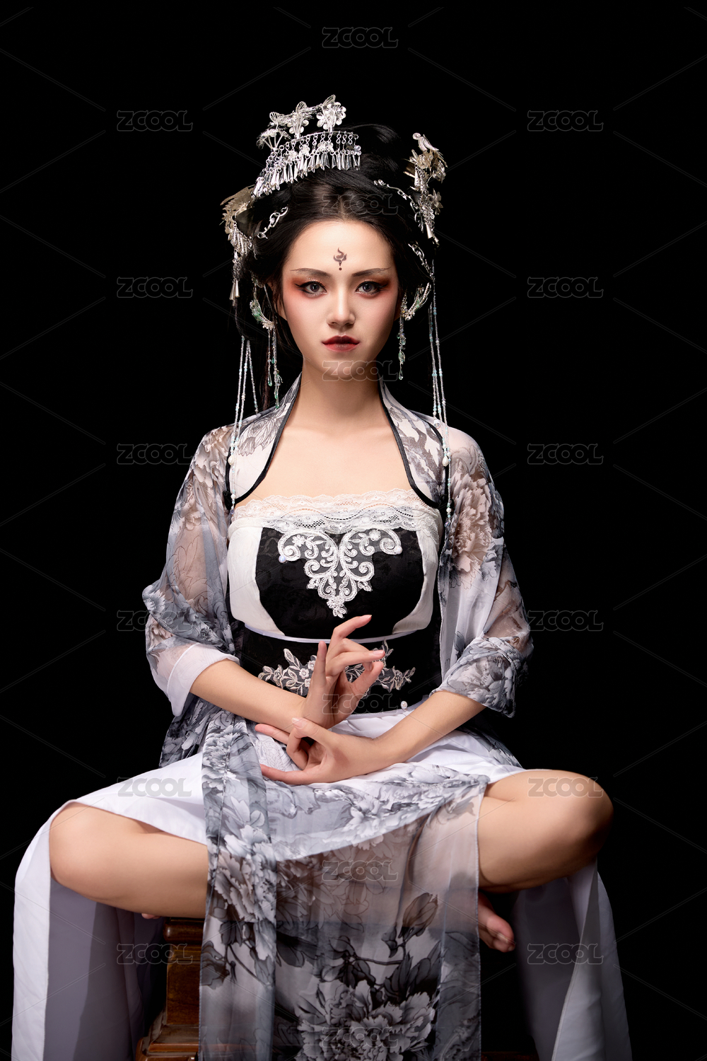 坐在木桌上穿着古装仙侠服饰的东方女性