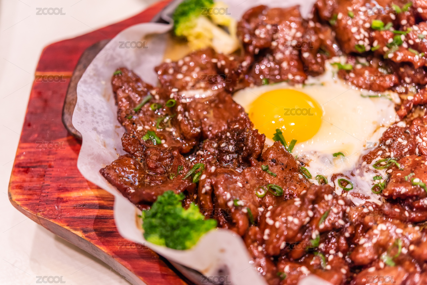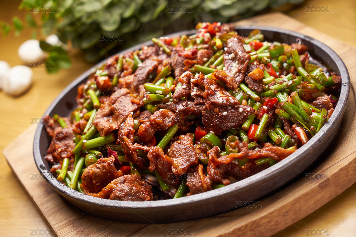 香辣美味的铁板牛肉盛放在圆形铁盘中