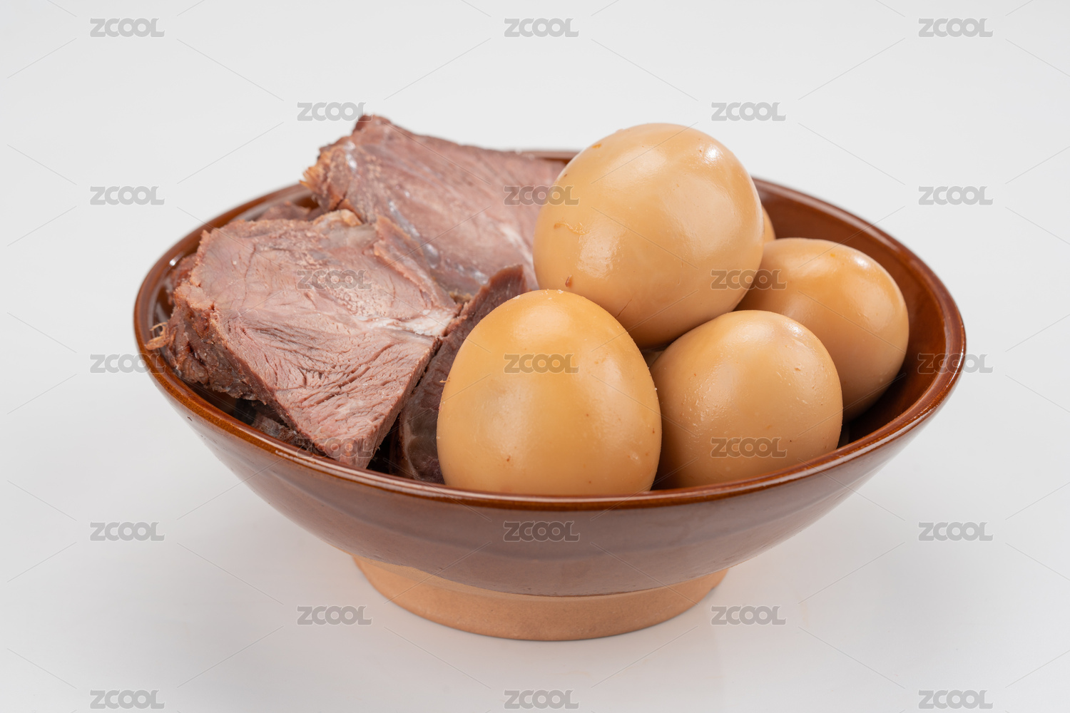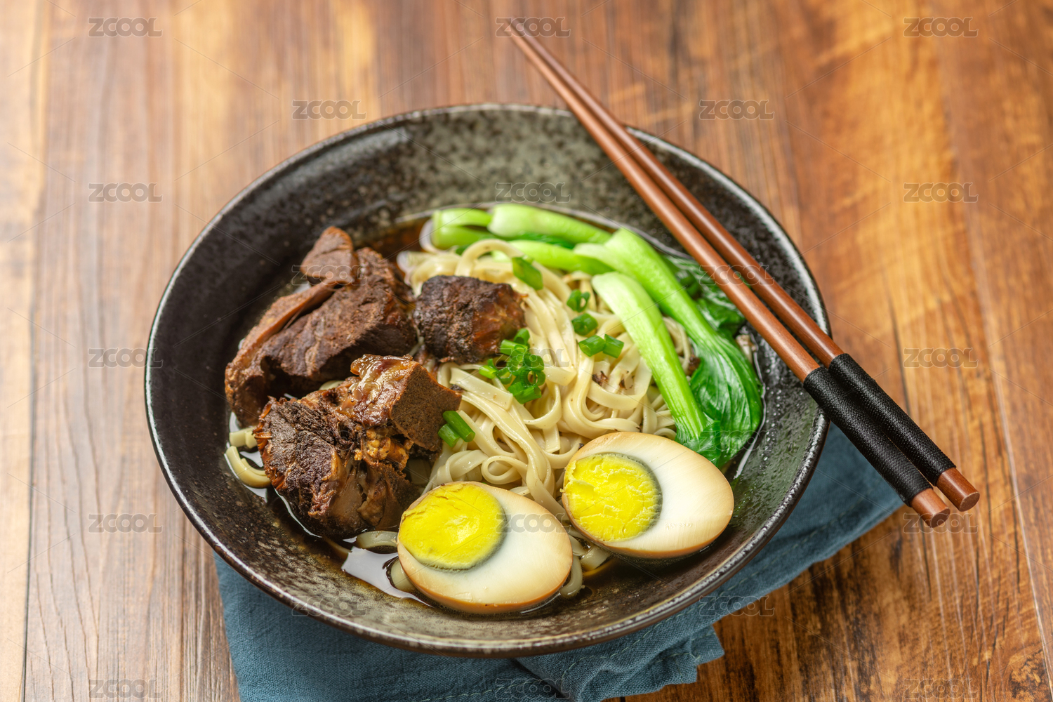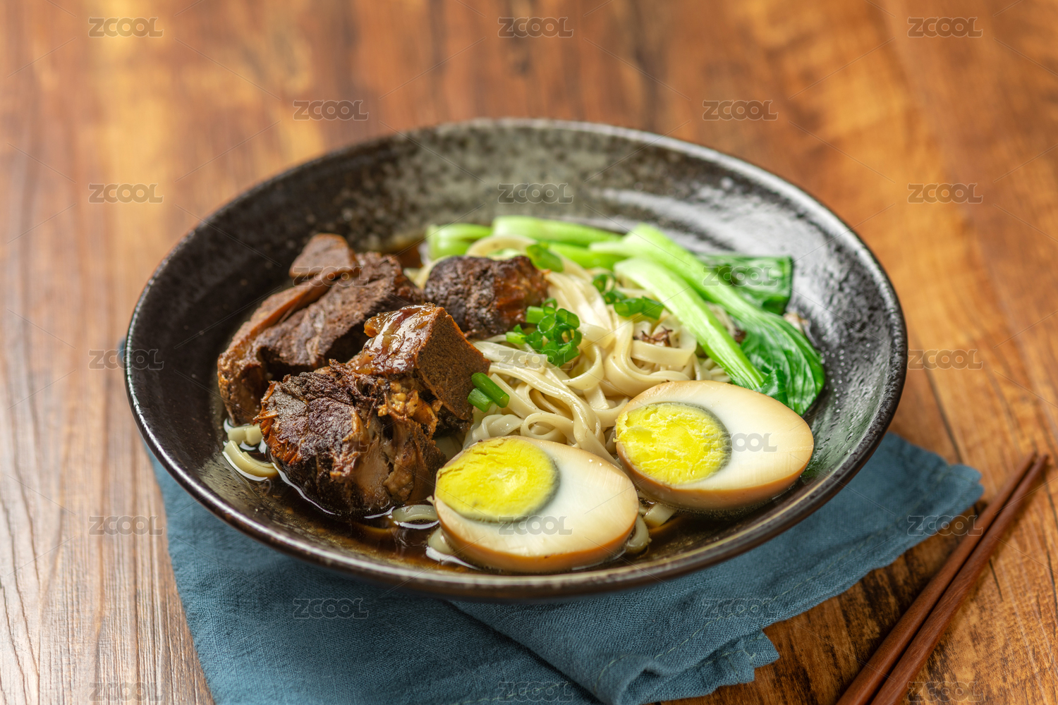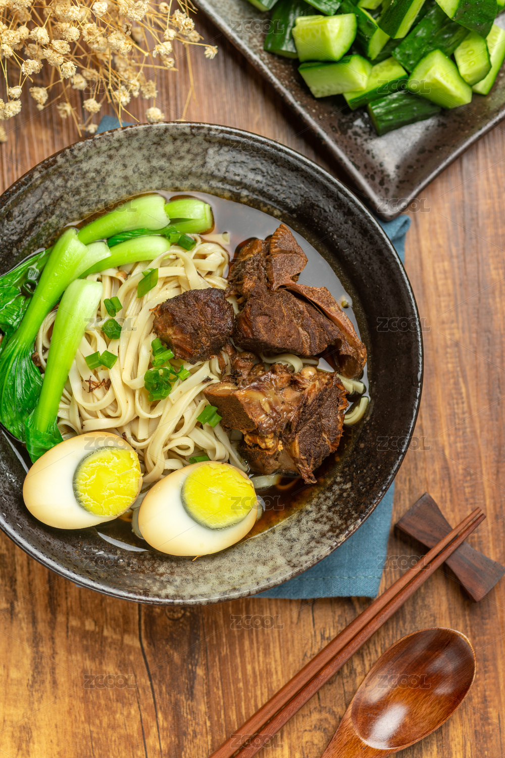排骨卤蛋面摆放在木桌面上旁边放有拌黄瓜