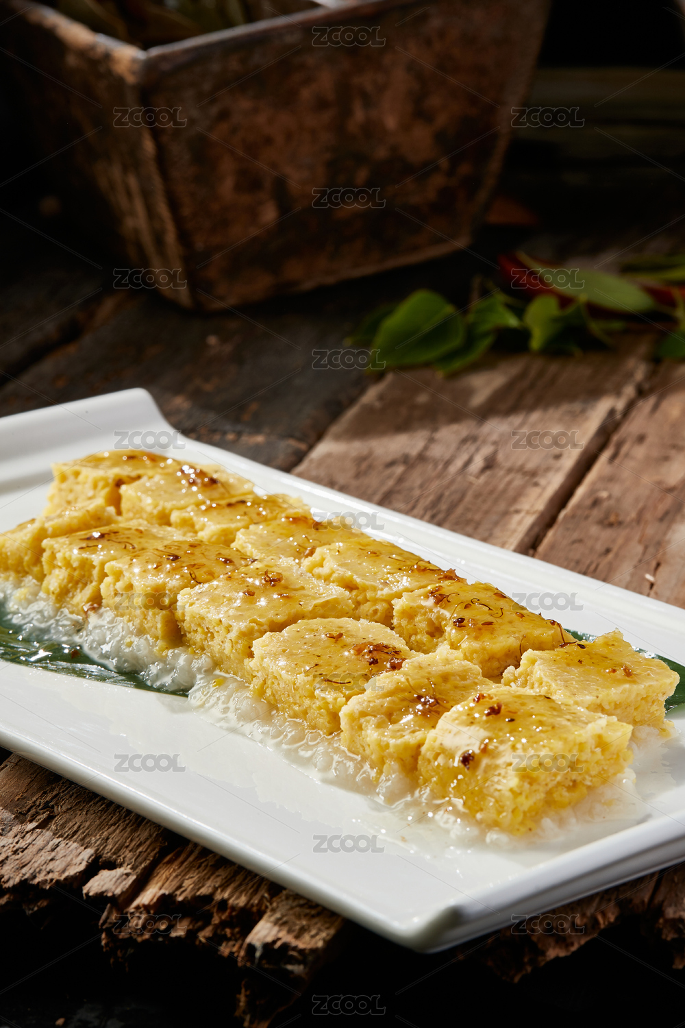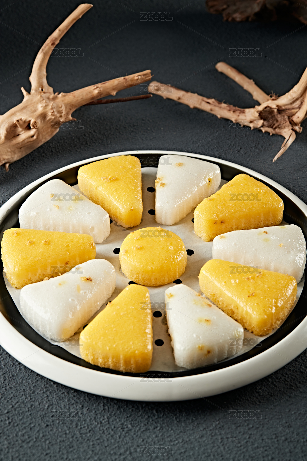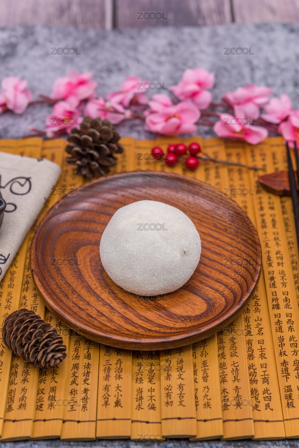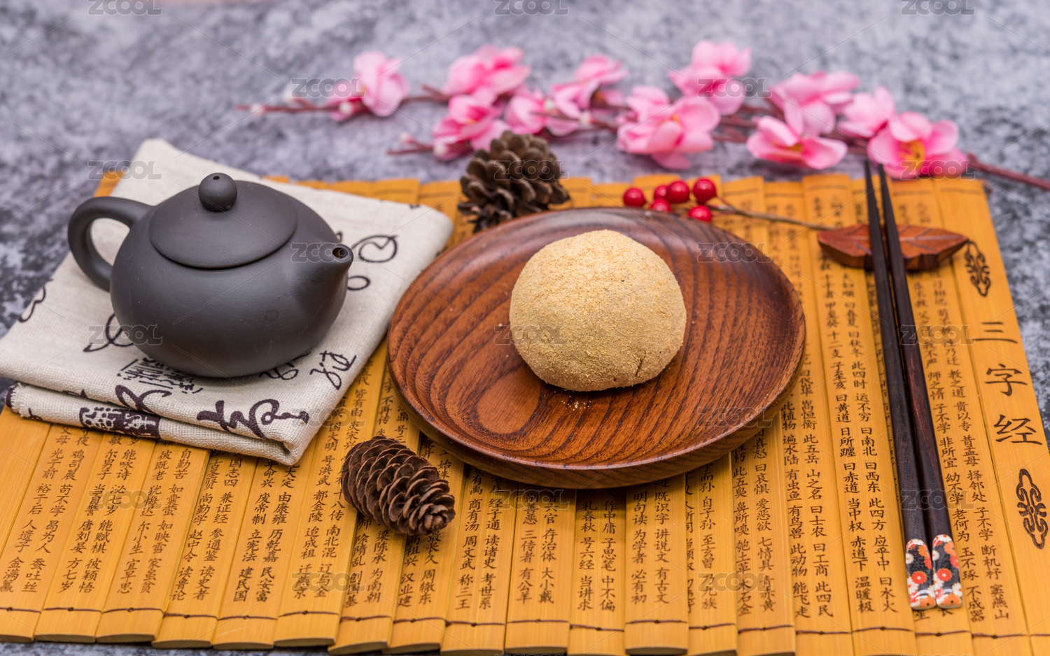 在中国书法和竹简的背景前有一盘糯米凉糕