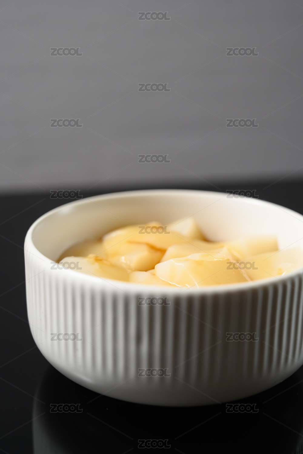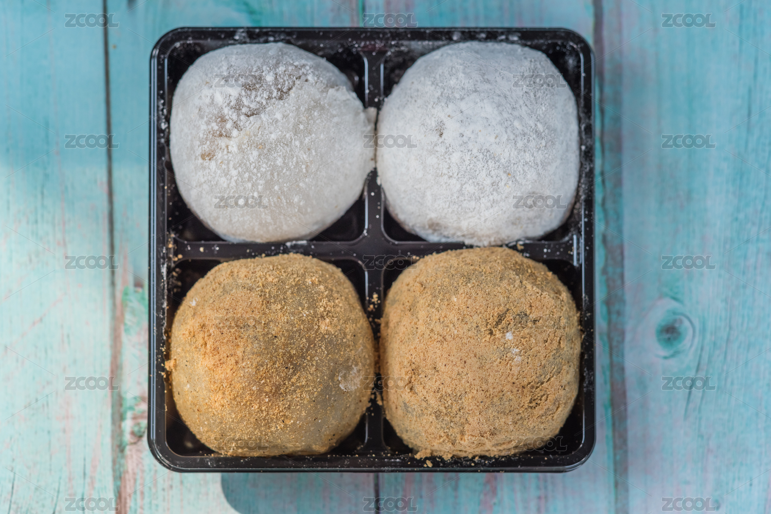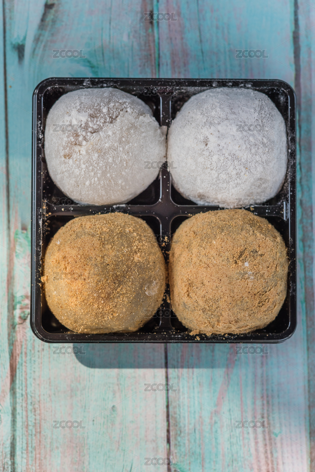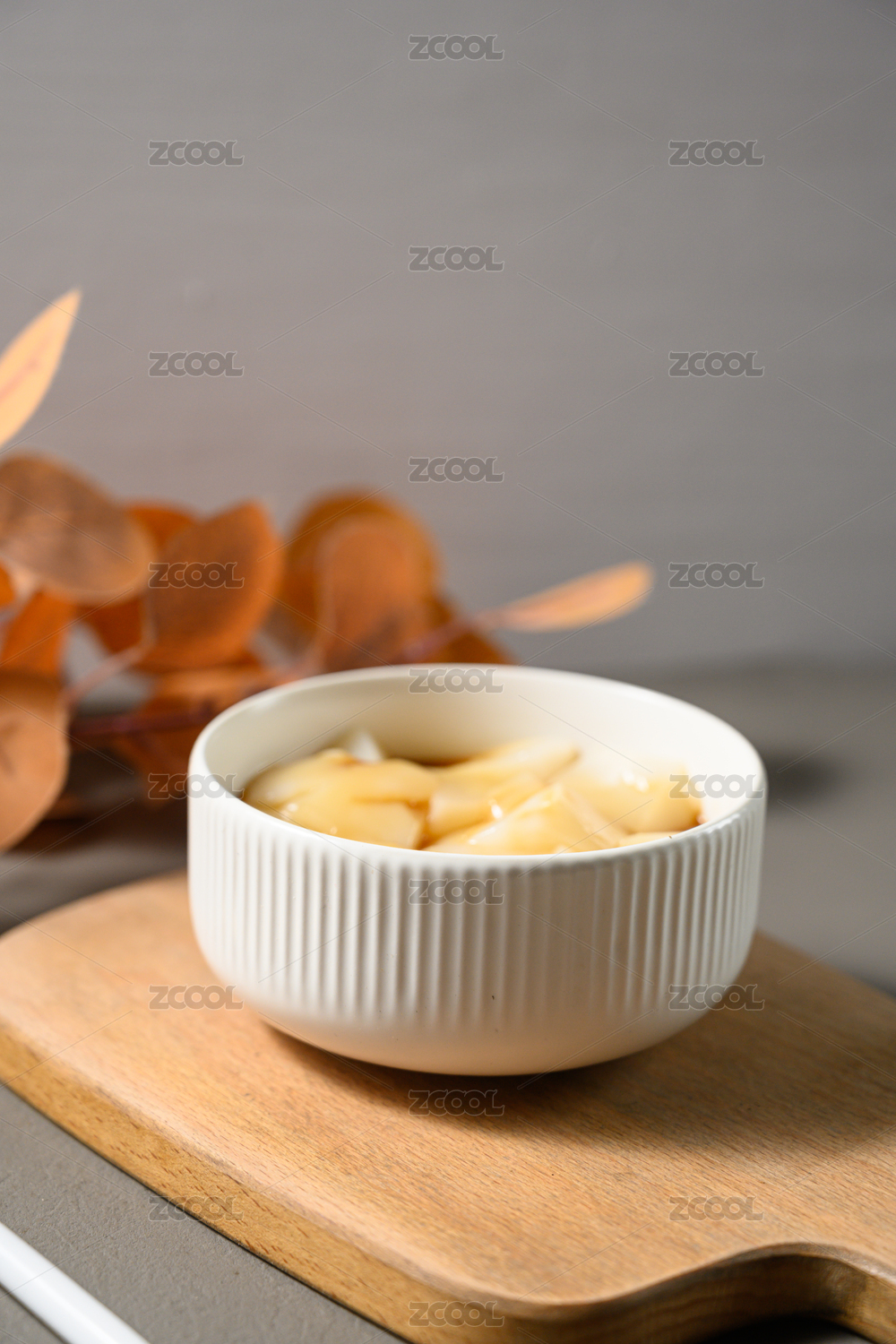 在中国书法和竹简的背景前有一盘糯米凉糕