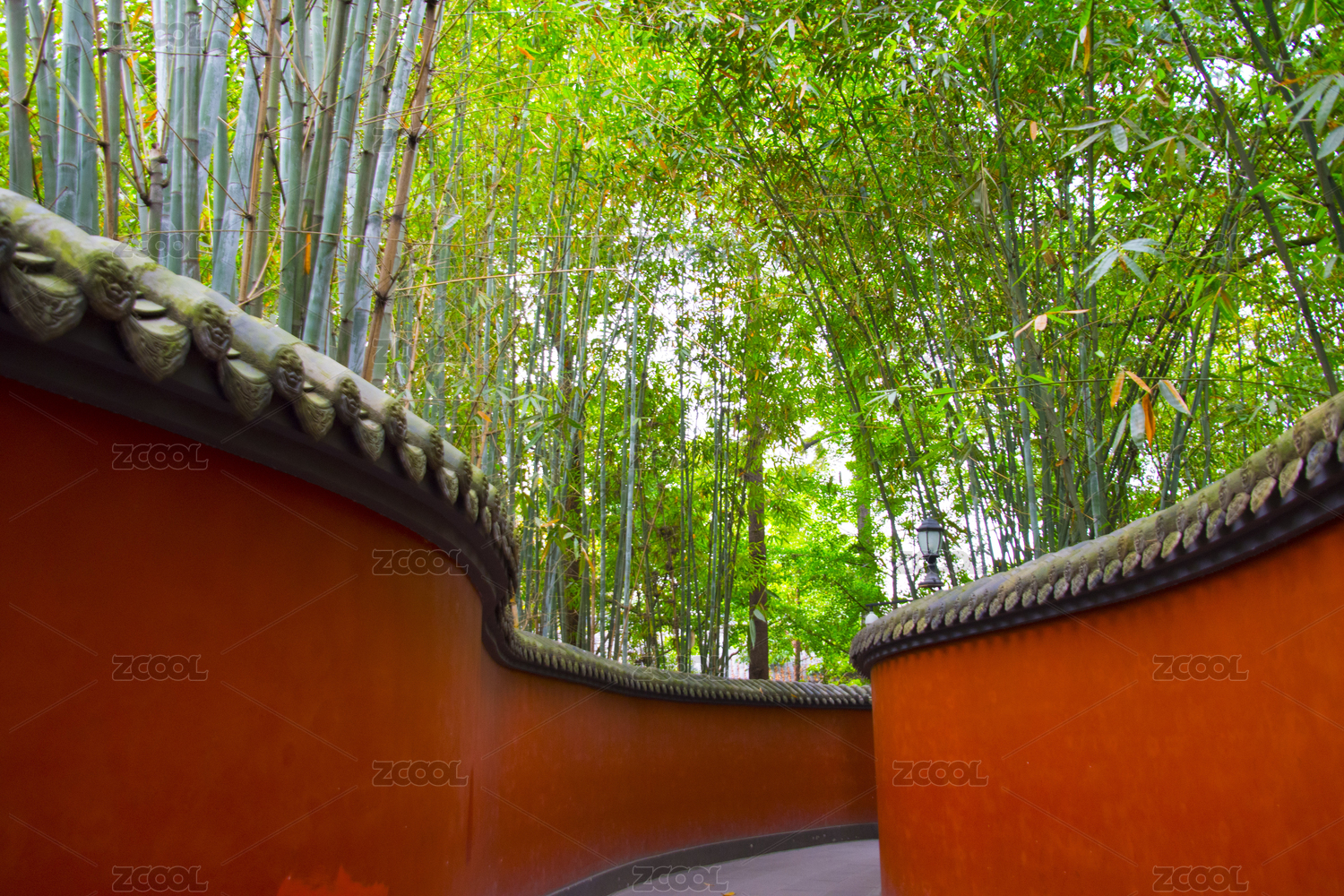 中国四川省成都市杜甫草堂里的红墙和绿竹