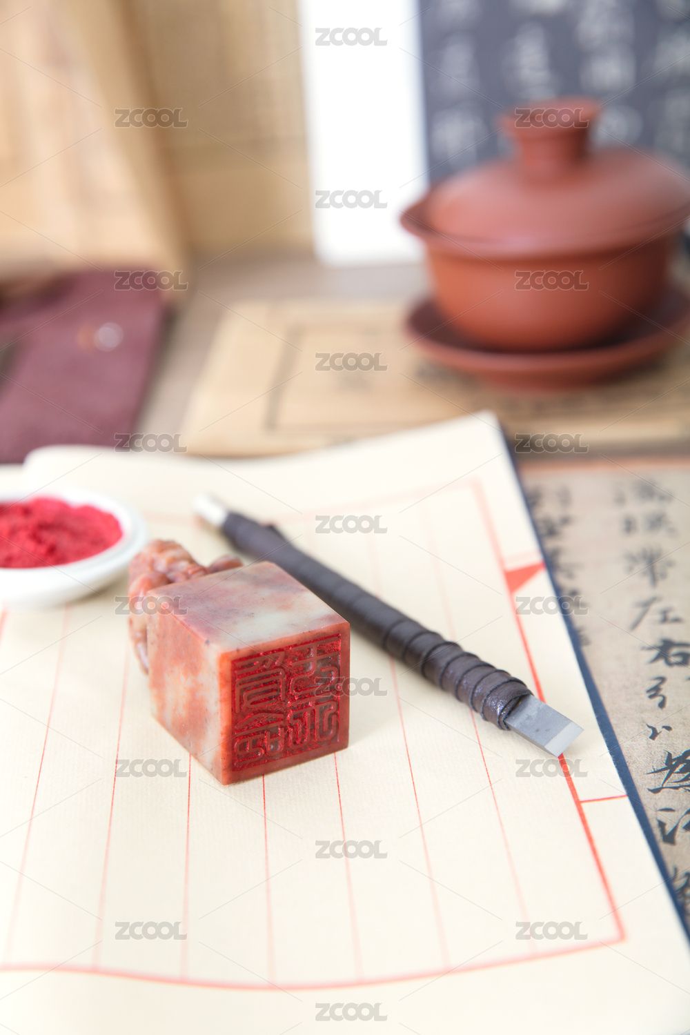 翻开中国线装古书和上面放置着的印章及刻刀