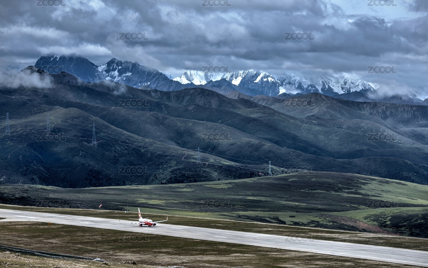 阴天浓云时飞机从雪山脚下的康定机场起飞