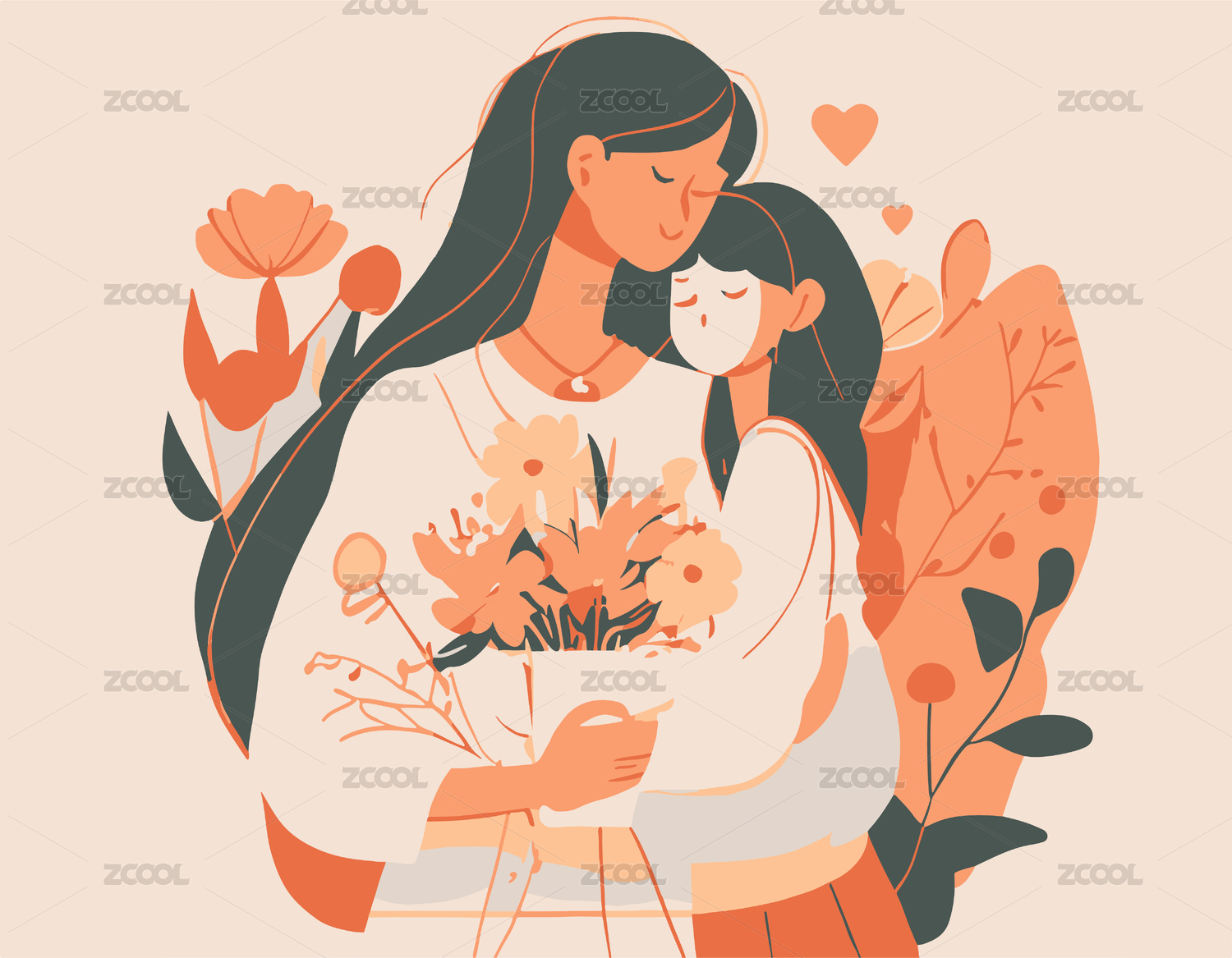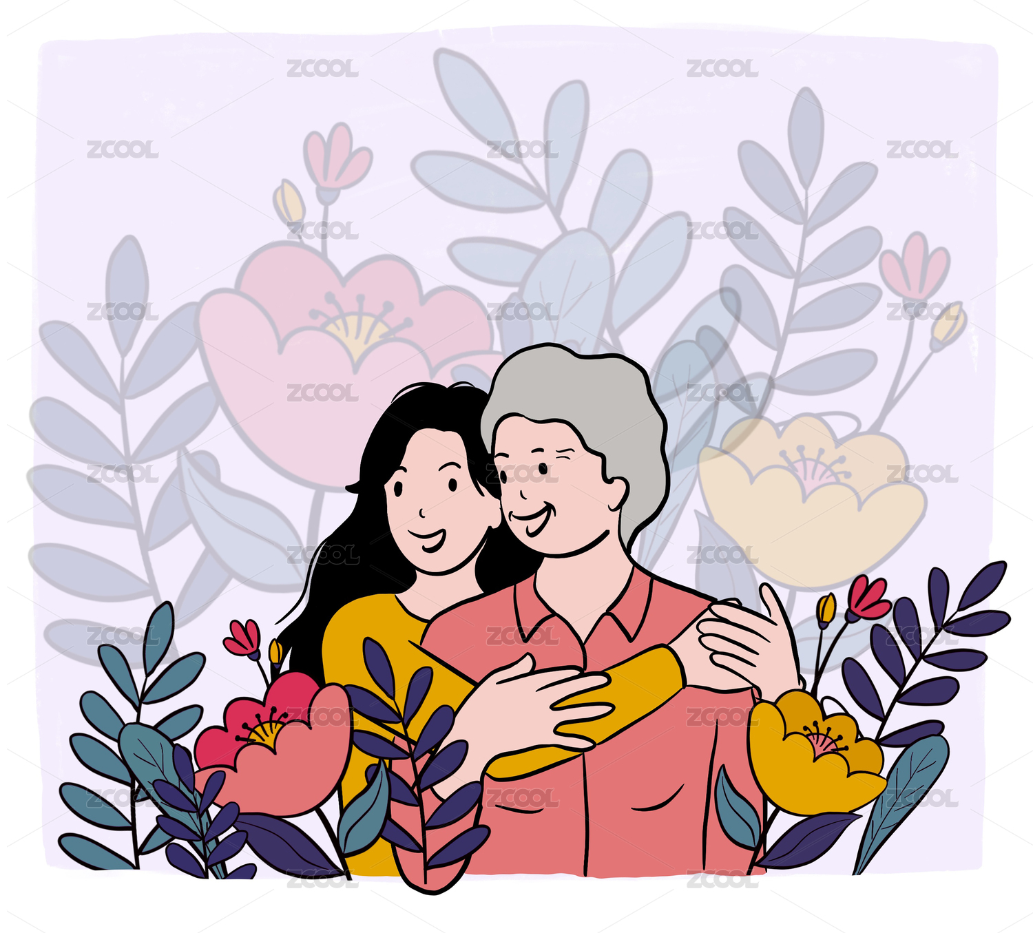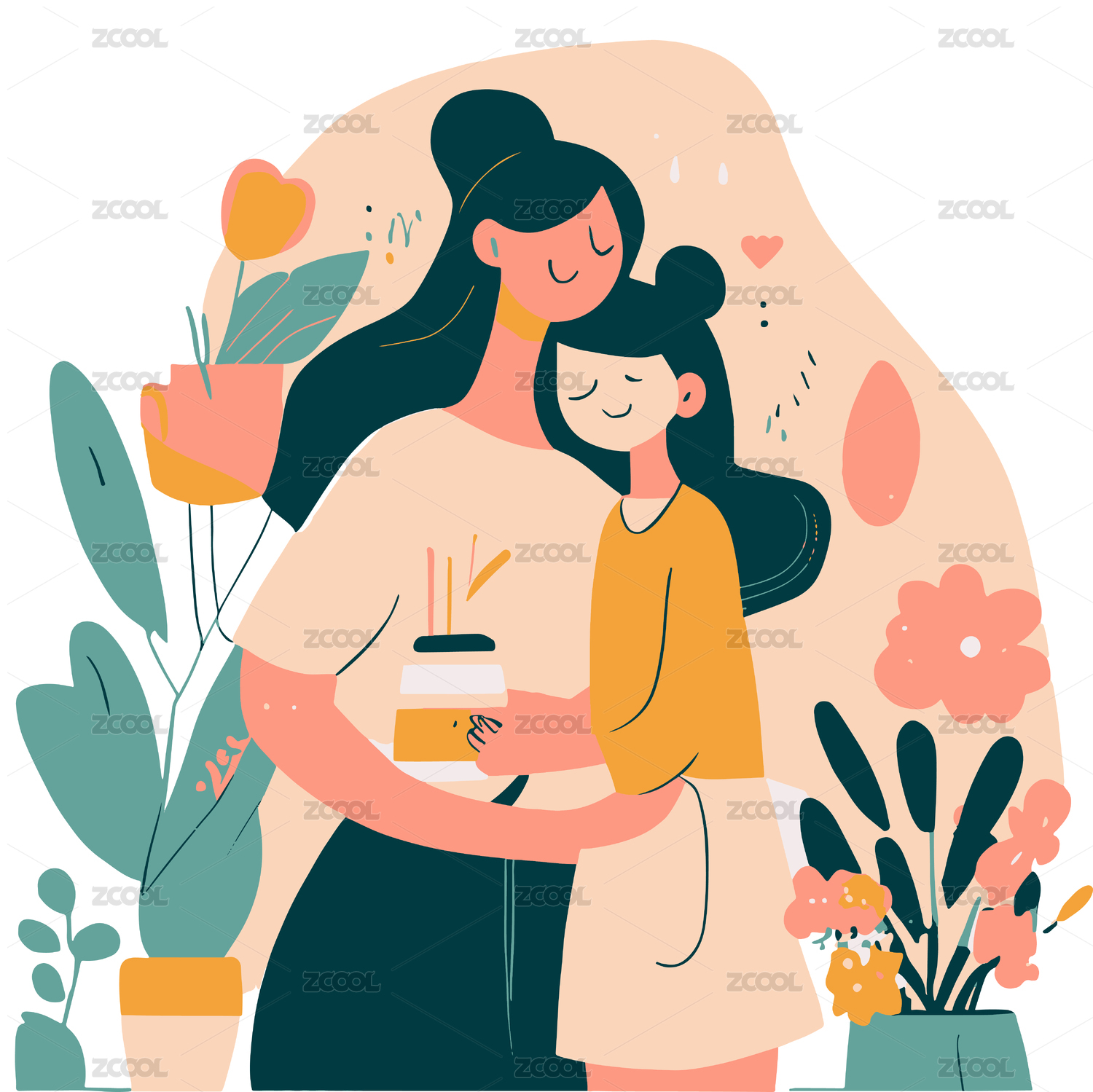 母亲节插画:女儿拥抱着母亲,妈妈辛苦了~爱你!