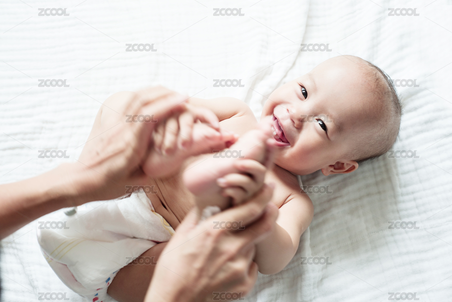 母亲和躺在床上的幼儿互动娱乐,幼儿开心地笑