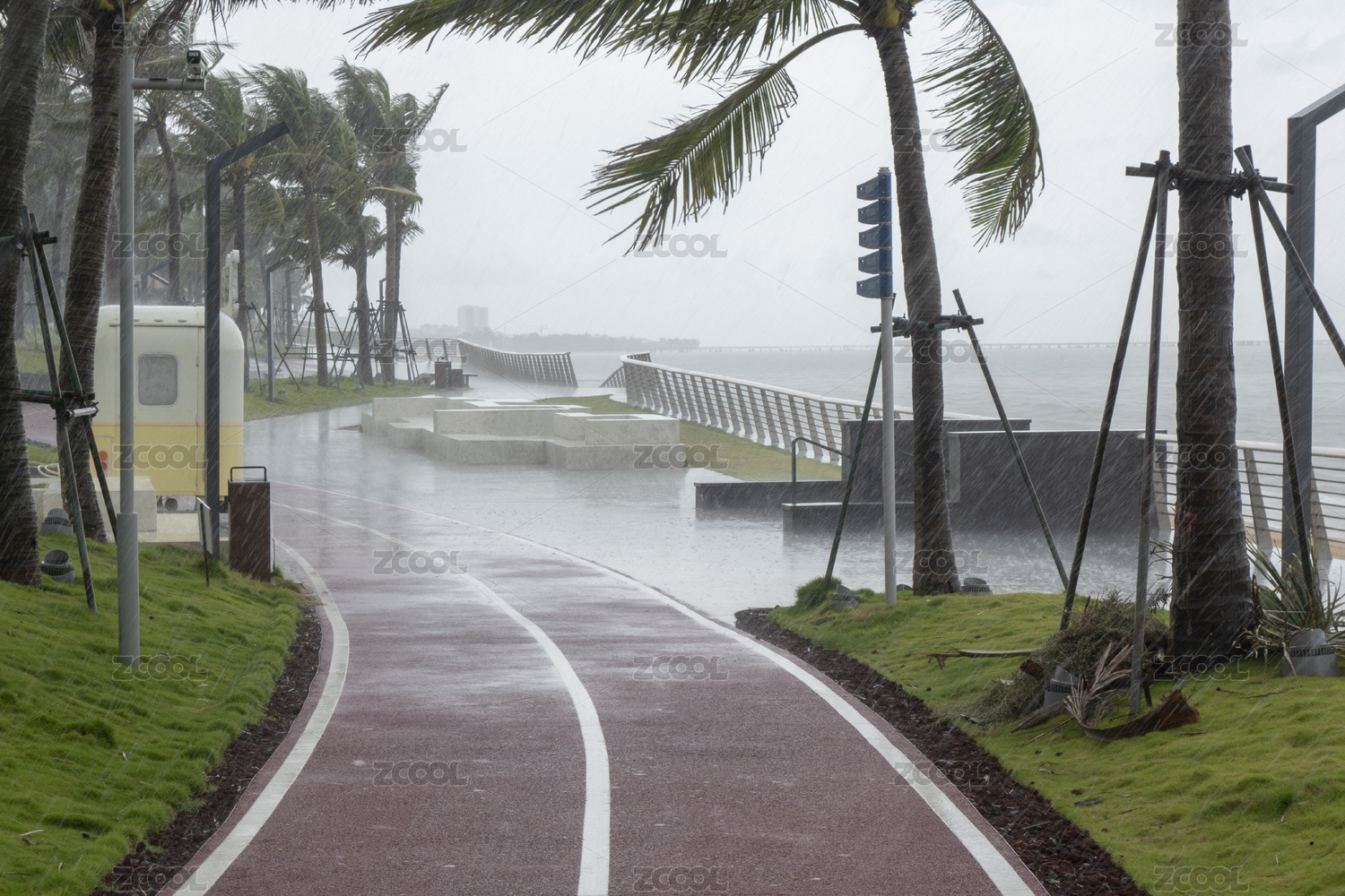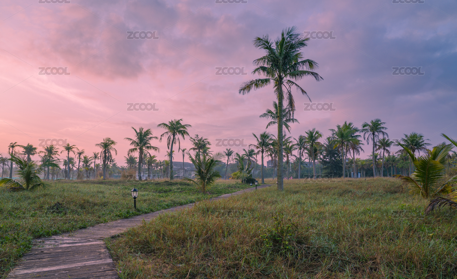 朝霞满天的早晨海南盈滨半岛椰林中健身步道