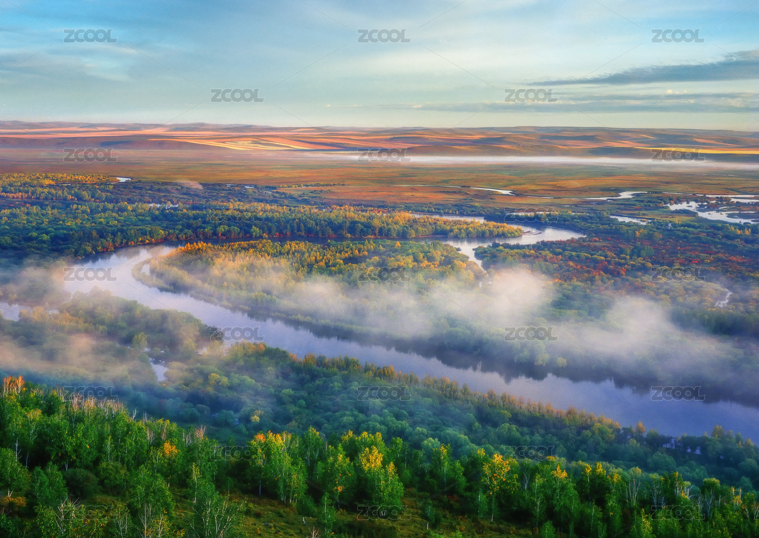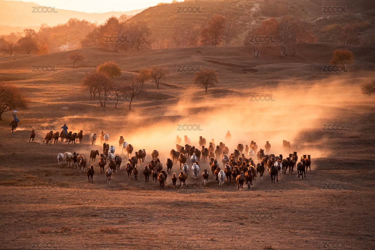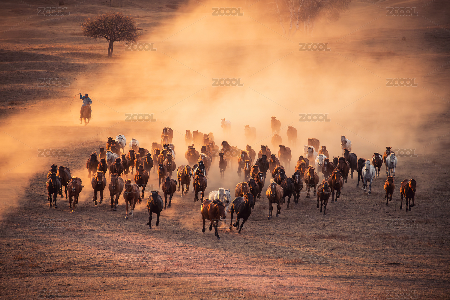 内蒙乌兰布统草原秋日夕阳下万马奔腾