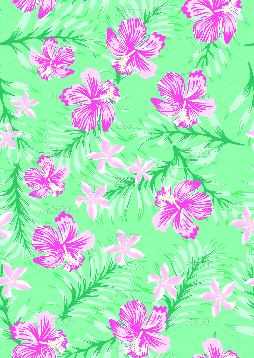 湖绿热带玫红花图案