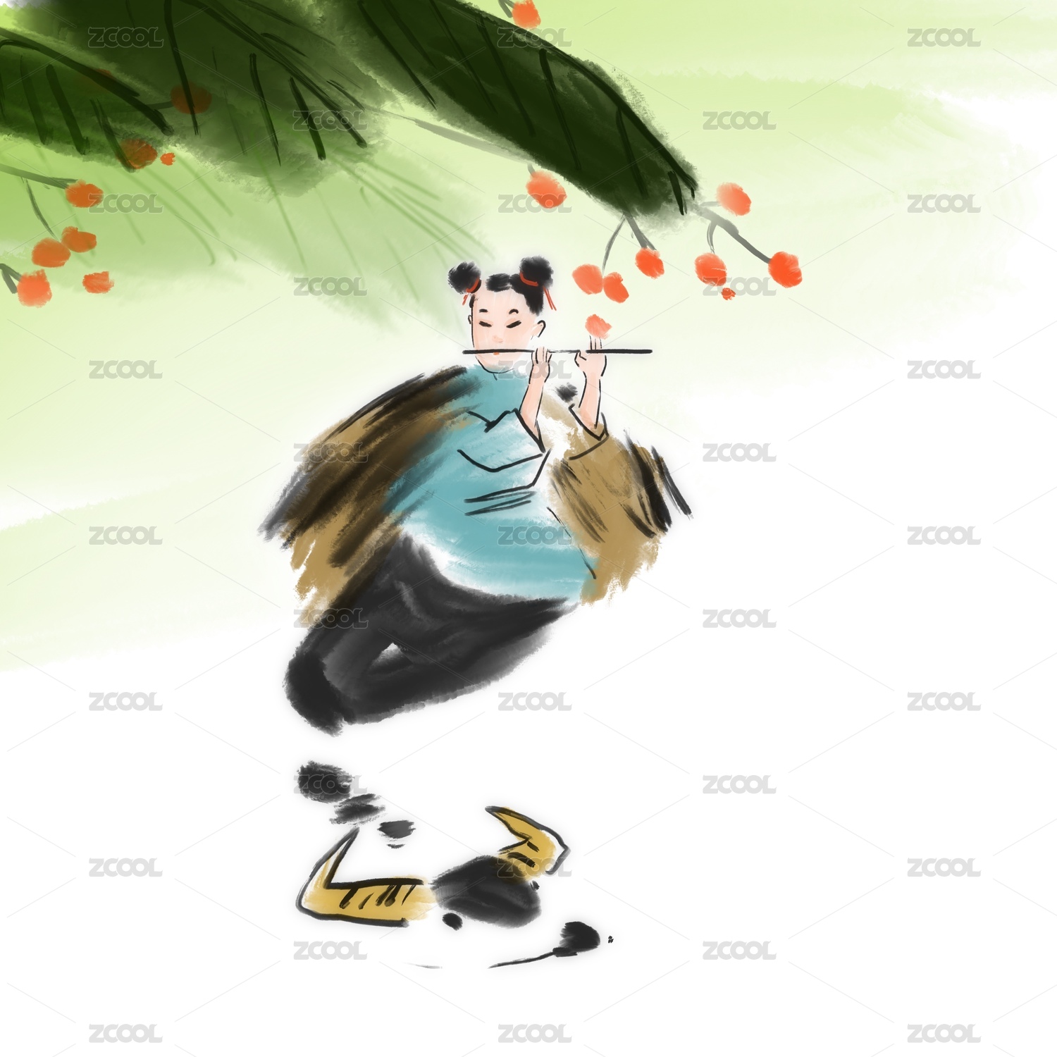 水墨人物画水墨江南江南水乡儿童与小毛驴水墨风景画