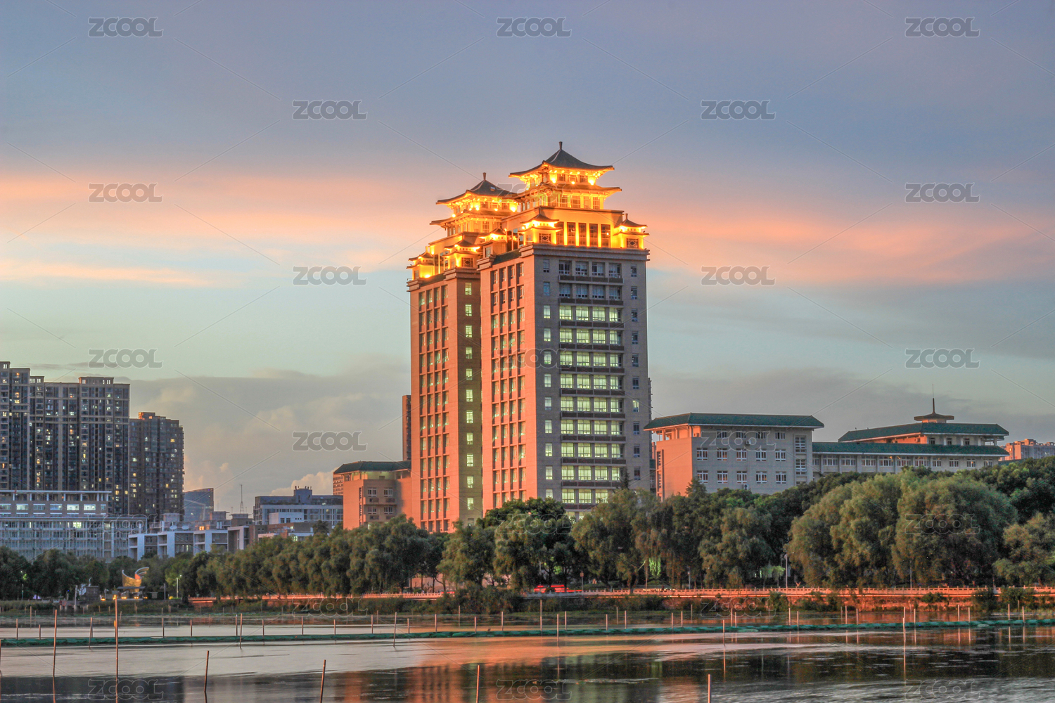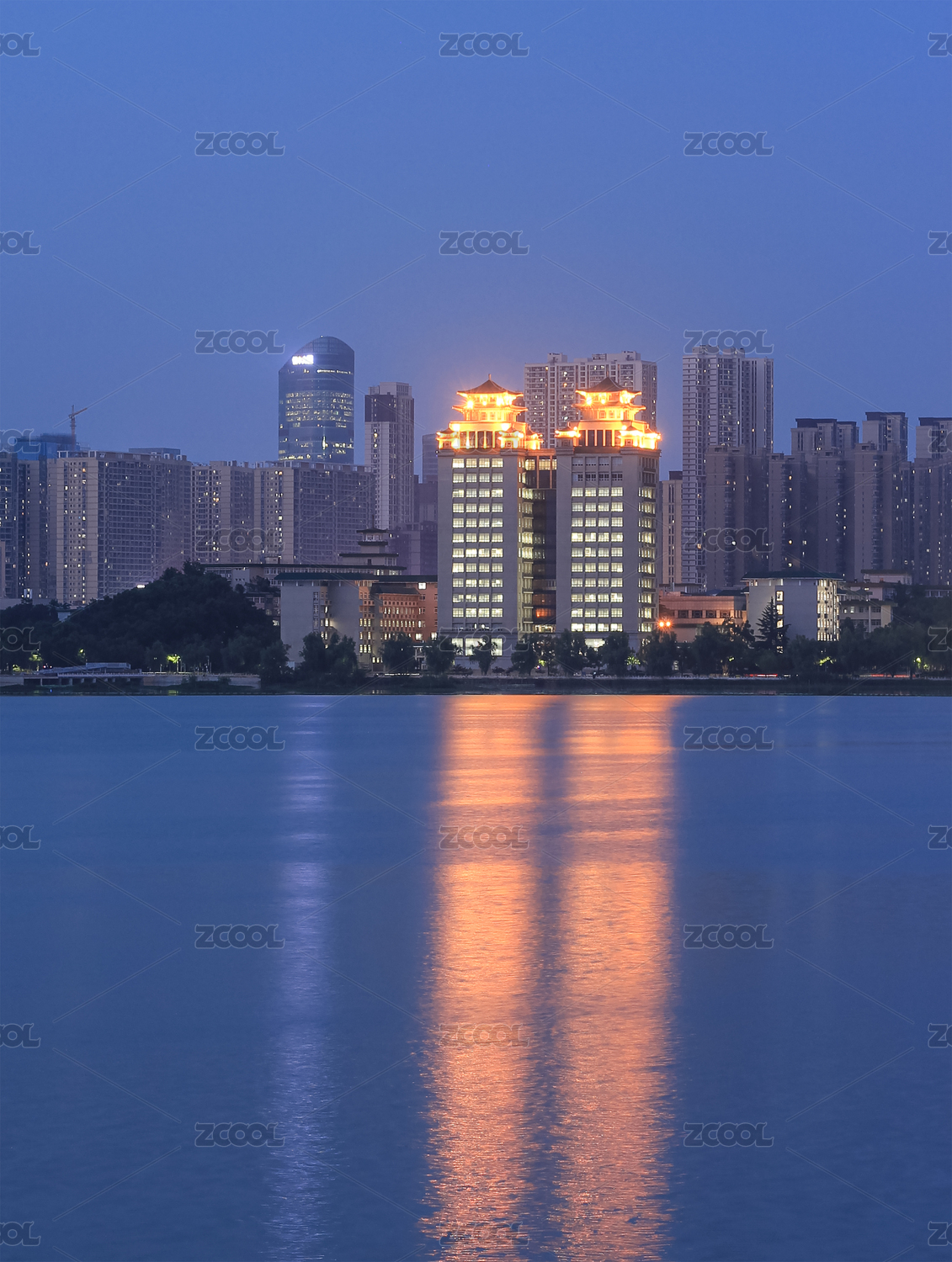武汉黄昏时的中南民族大学双塔楼