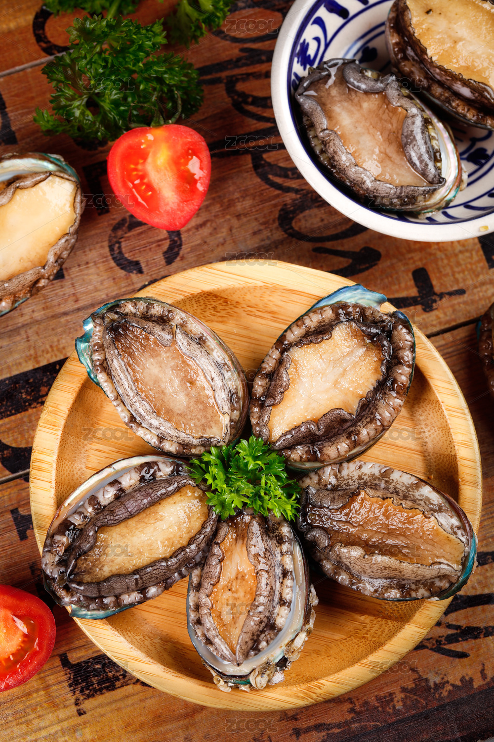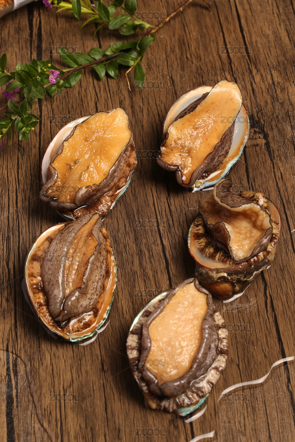 木桌上的新鲜活鲍鱼