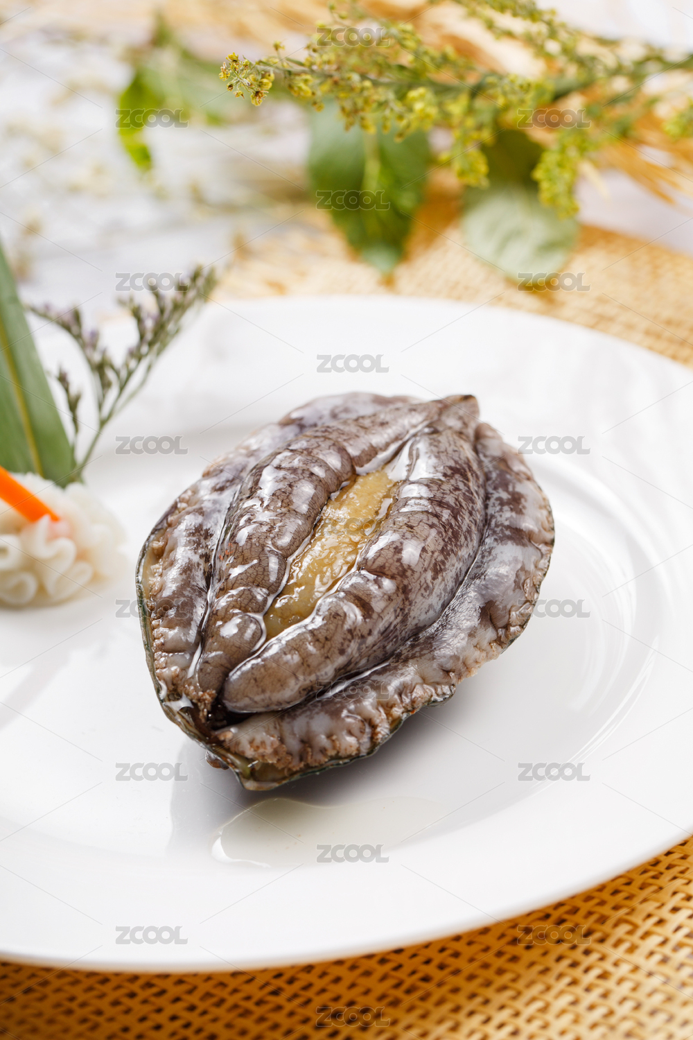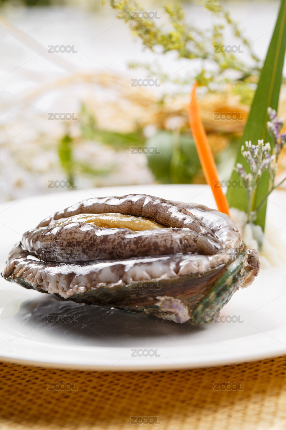 圆形瓷盘装的八头活鲍鱼摆放在草垫上