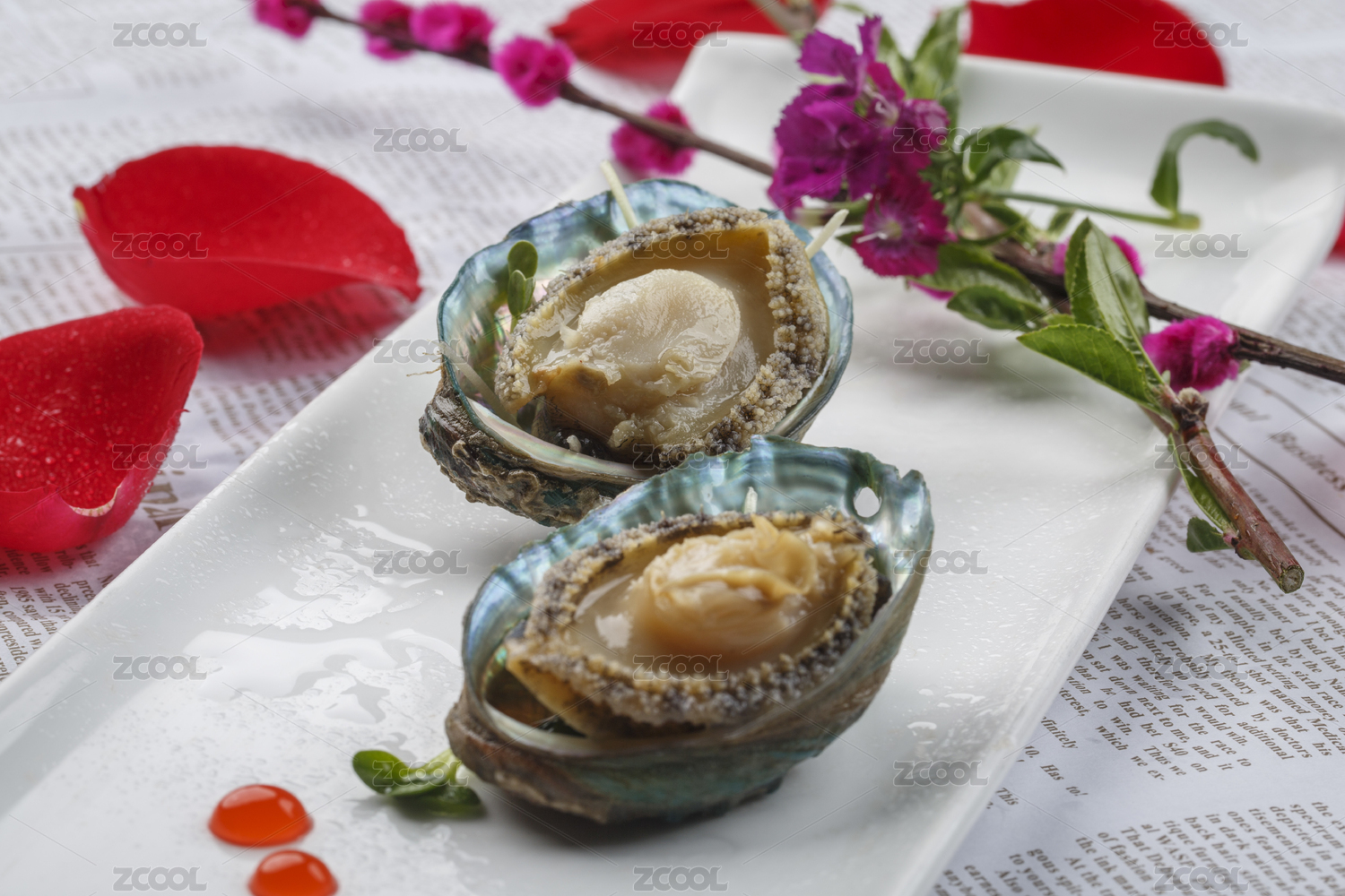 长方形白瓷盘装的刺身活鲍鱼