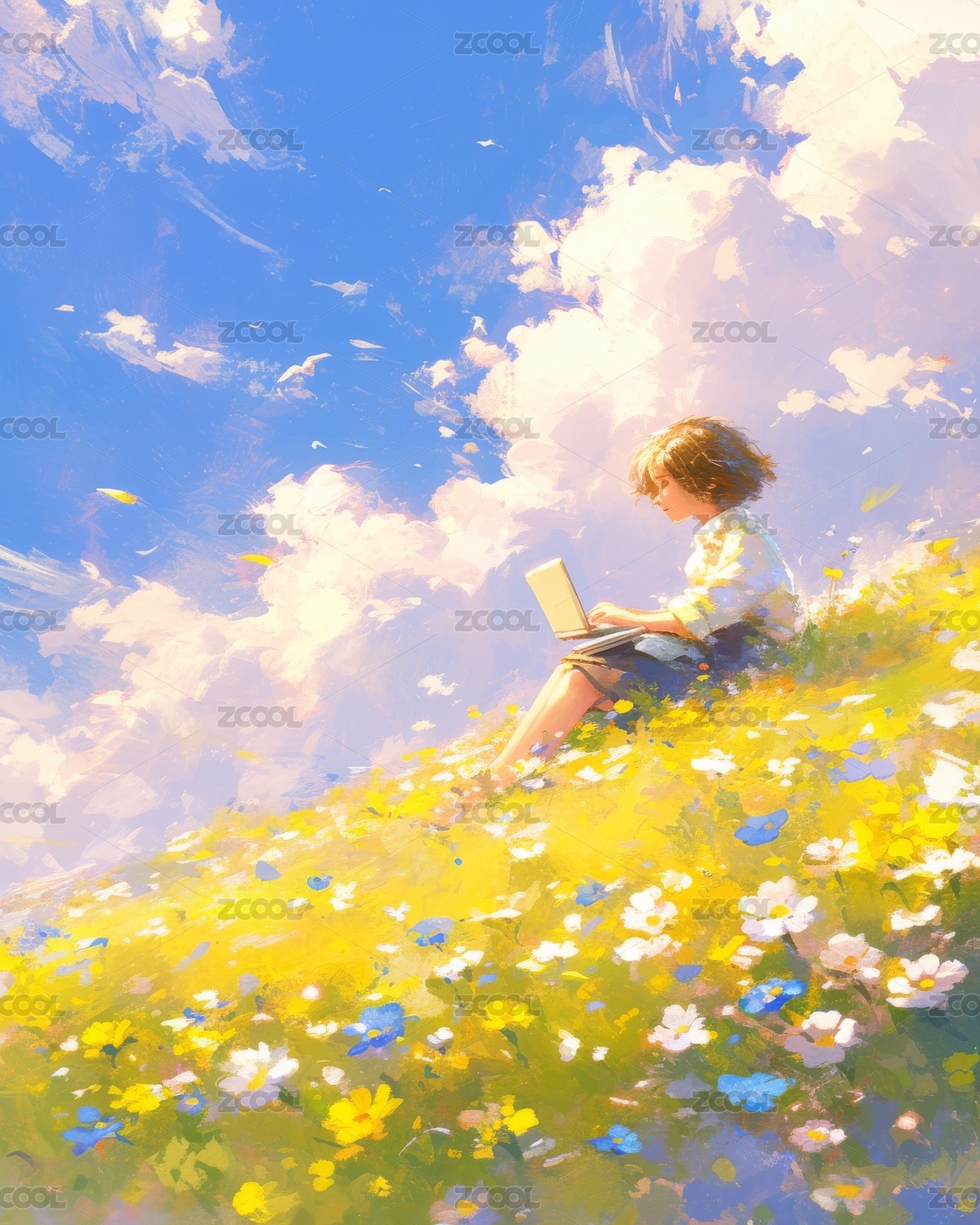 晴天在户外草坪上用电脑的小男孩