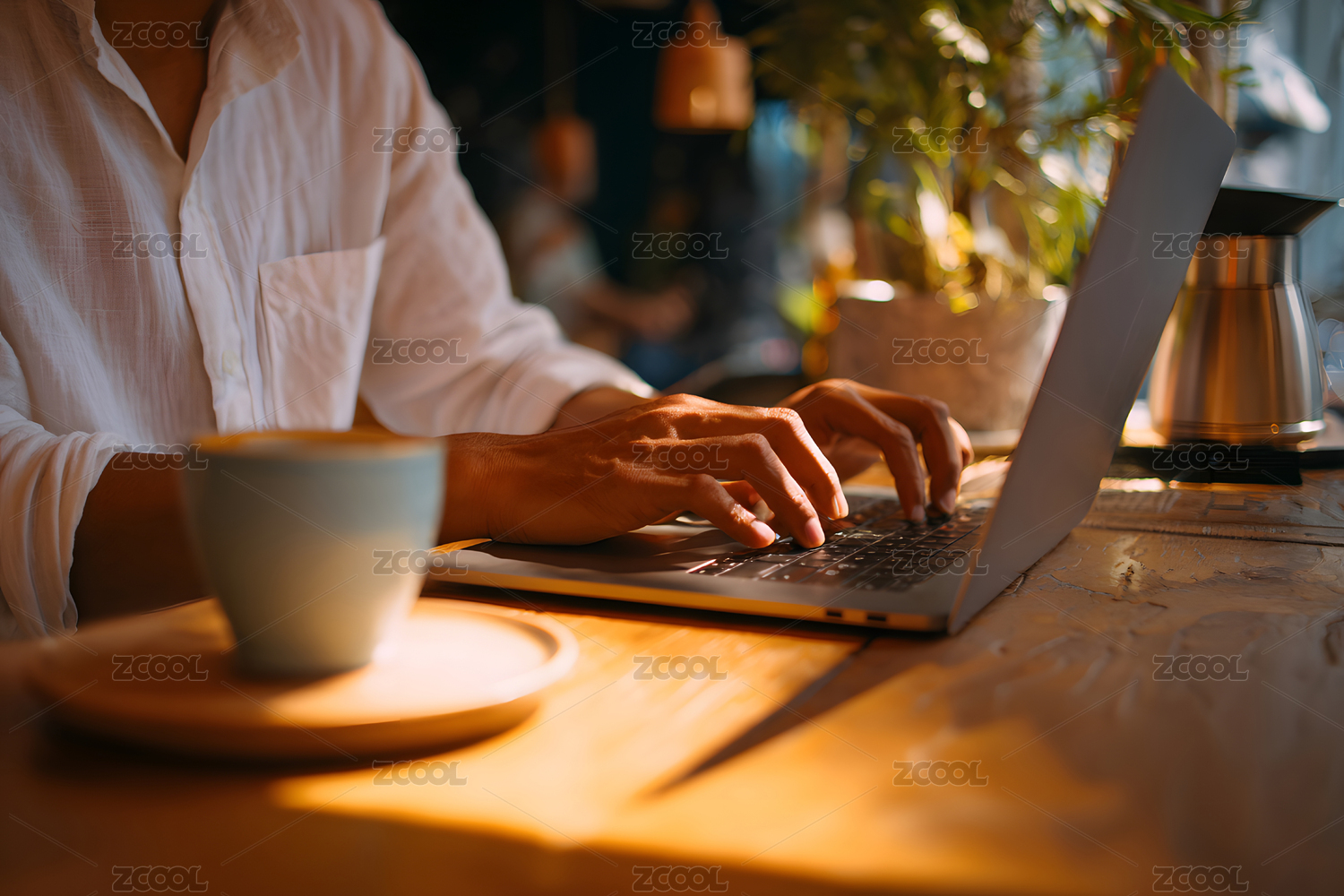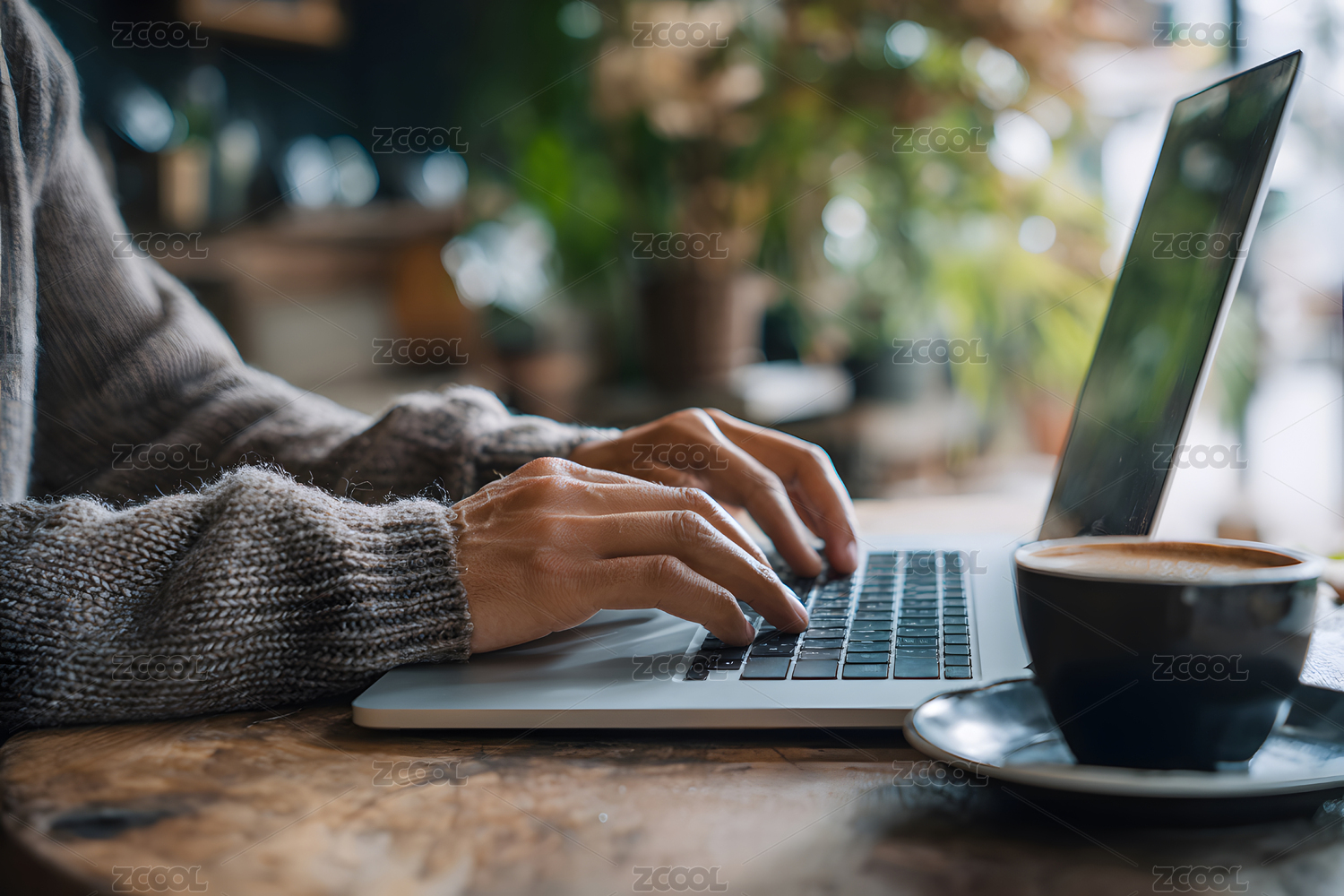 咖啡馆内手敲笔记本电脑