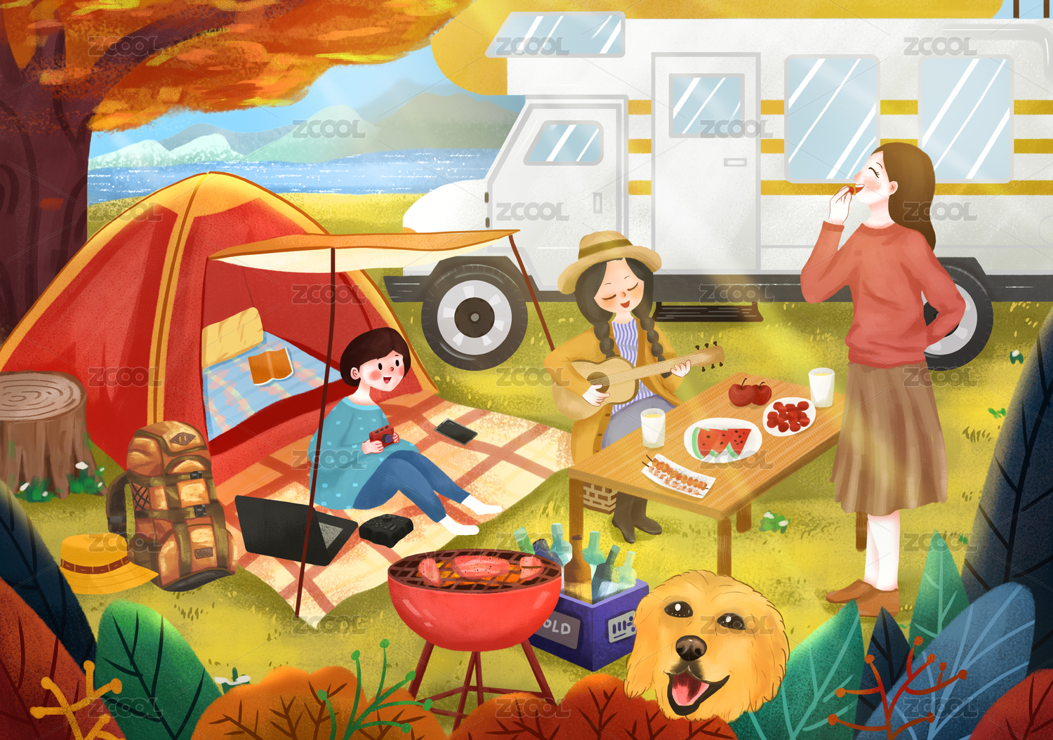 夜晚在山野森林中女孩带着小狗边工作边露营