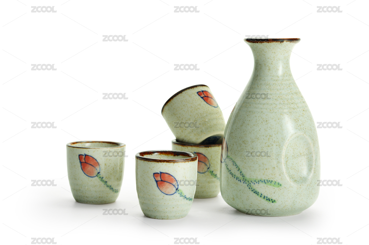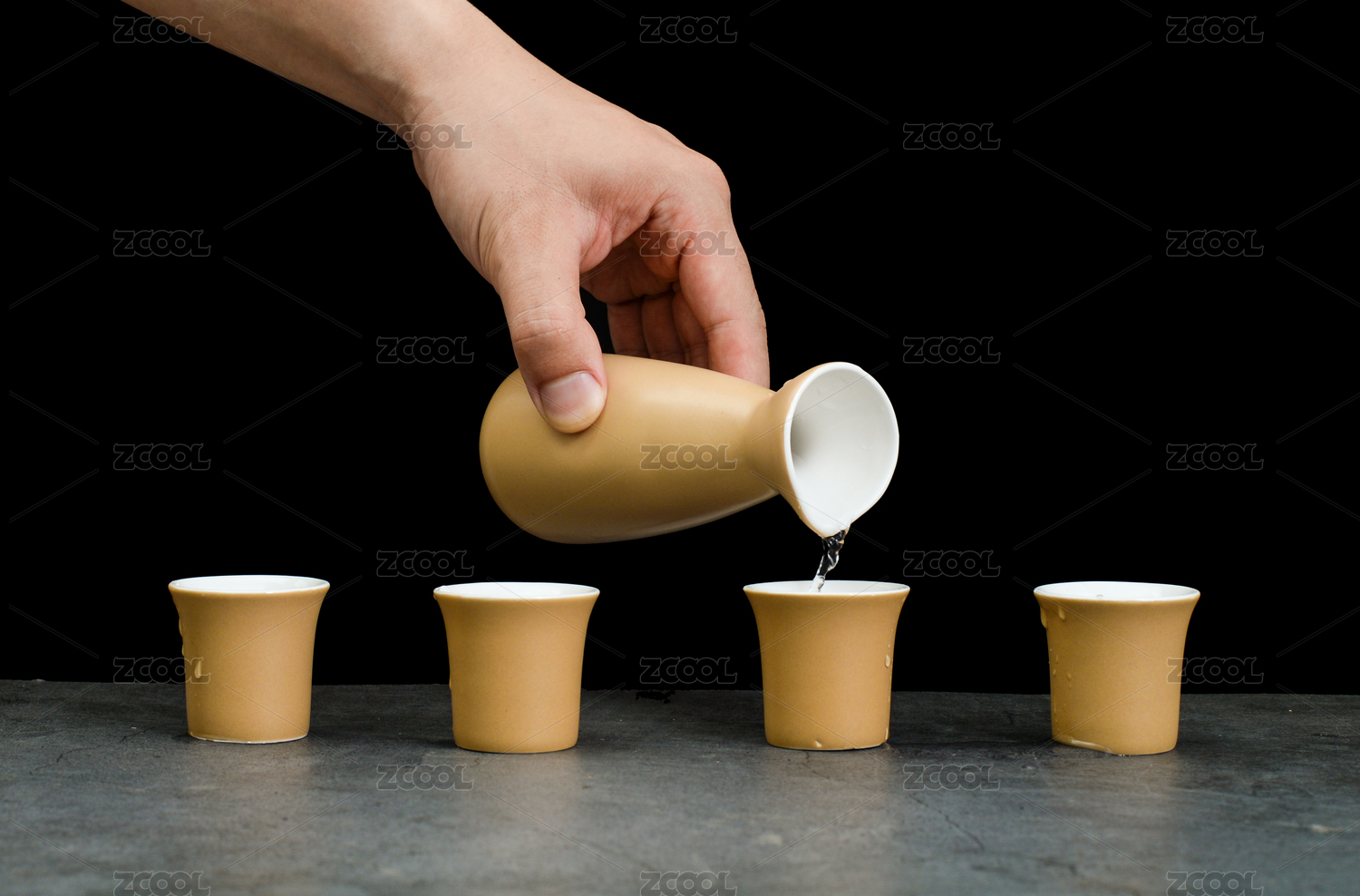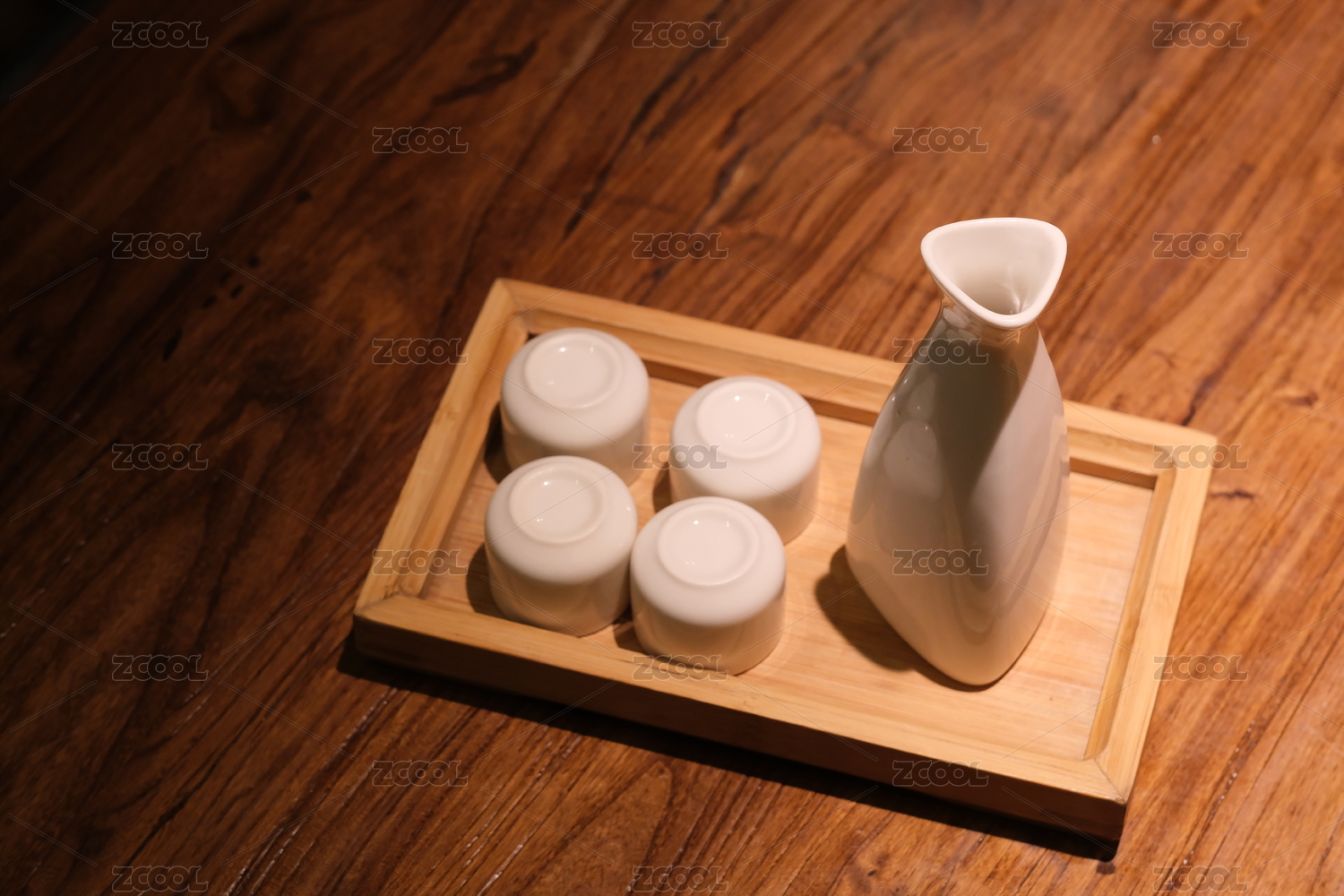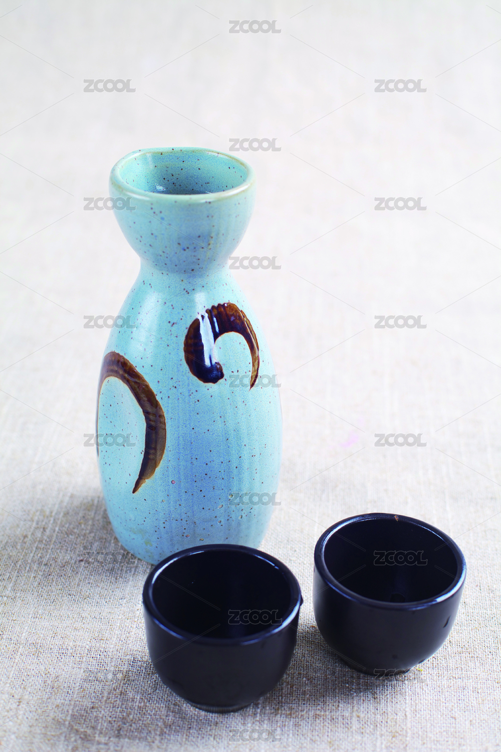 放在麻布上的蓝色日式清酒盅和黑色酒杯