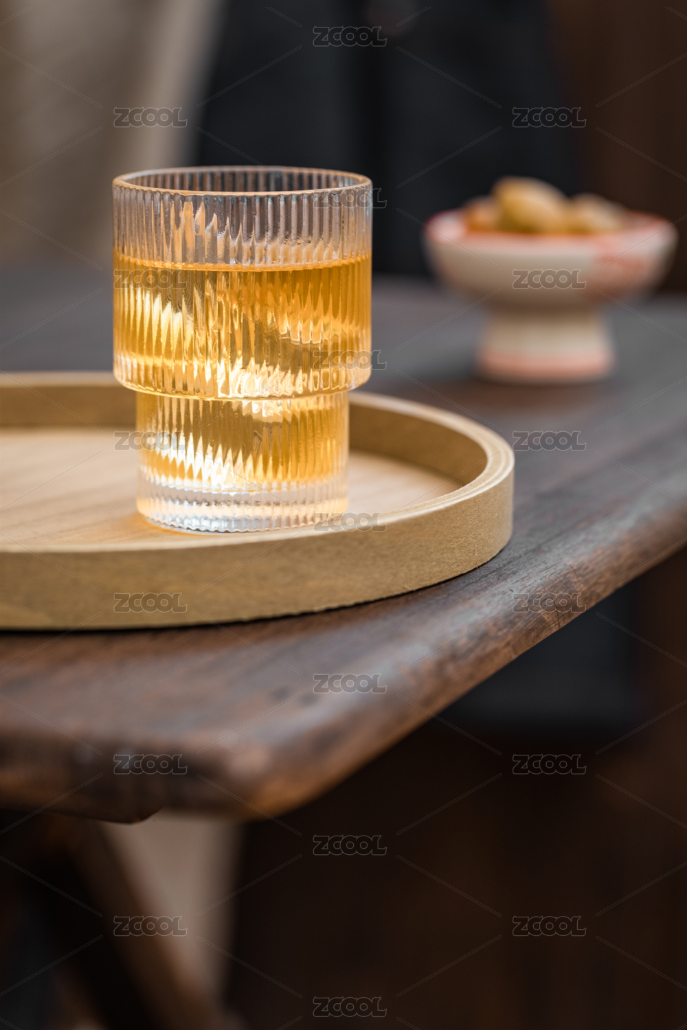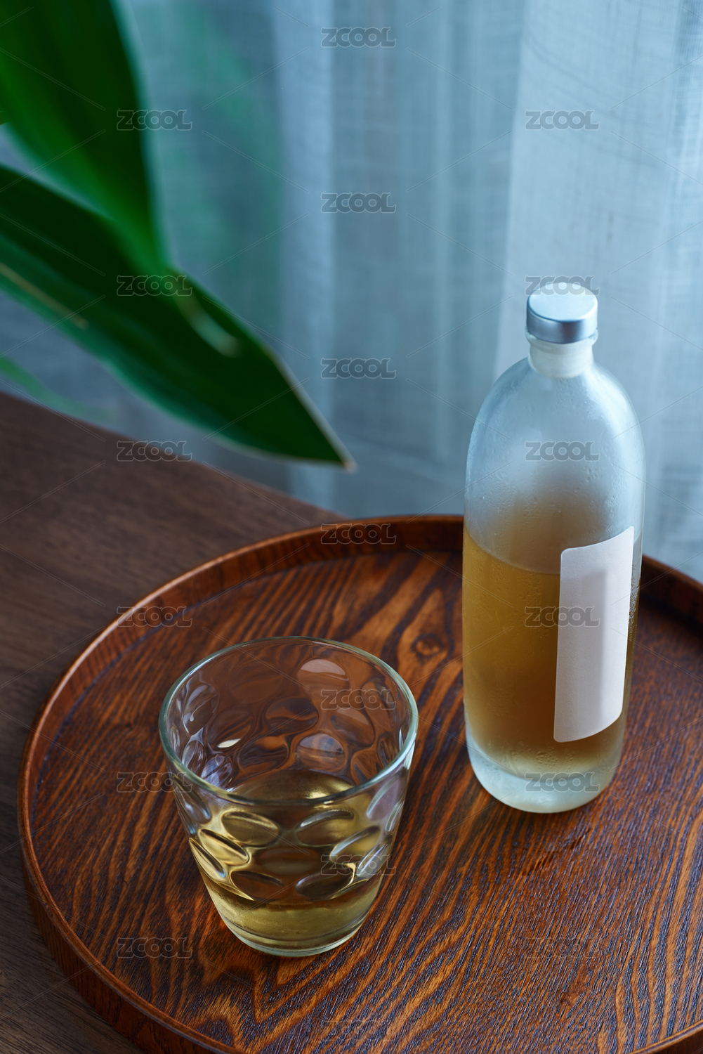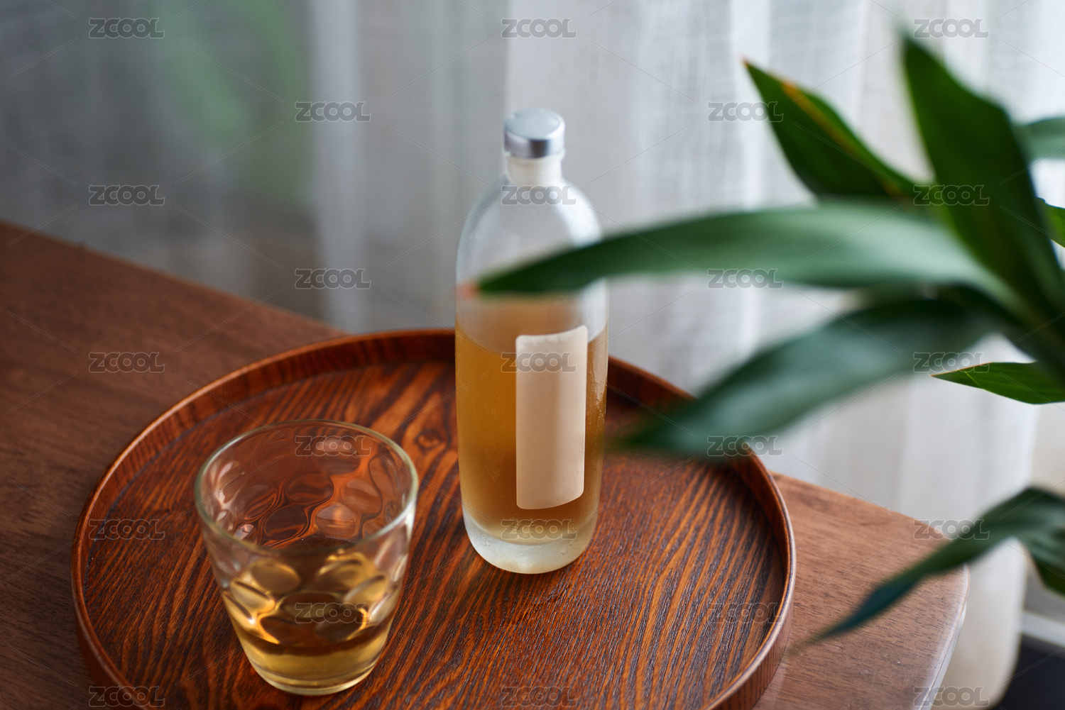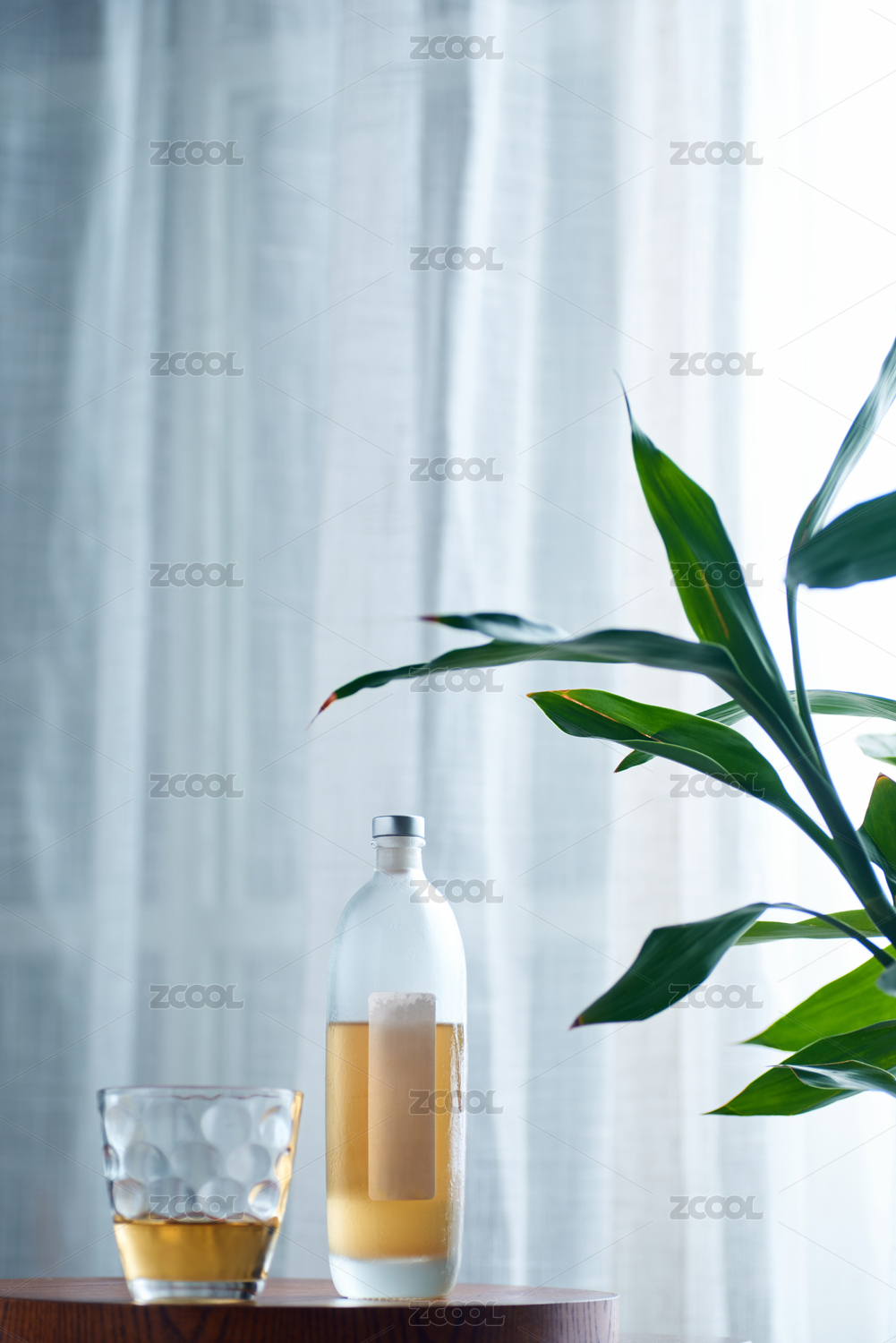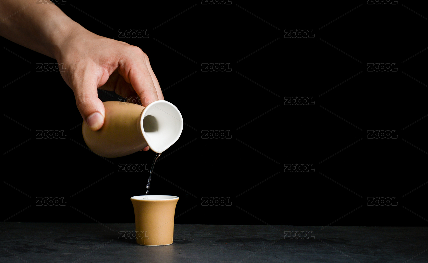 放在麻布上的蓝色日式清酒盅和黑色酒杯