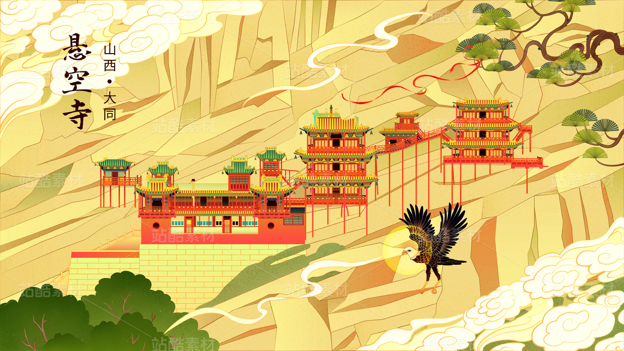 山西大同悬空寺国潮插画