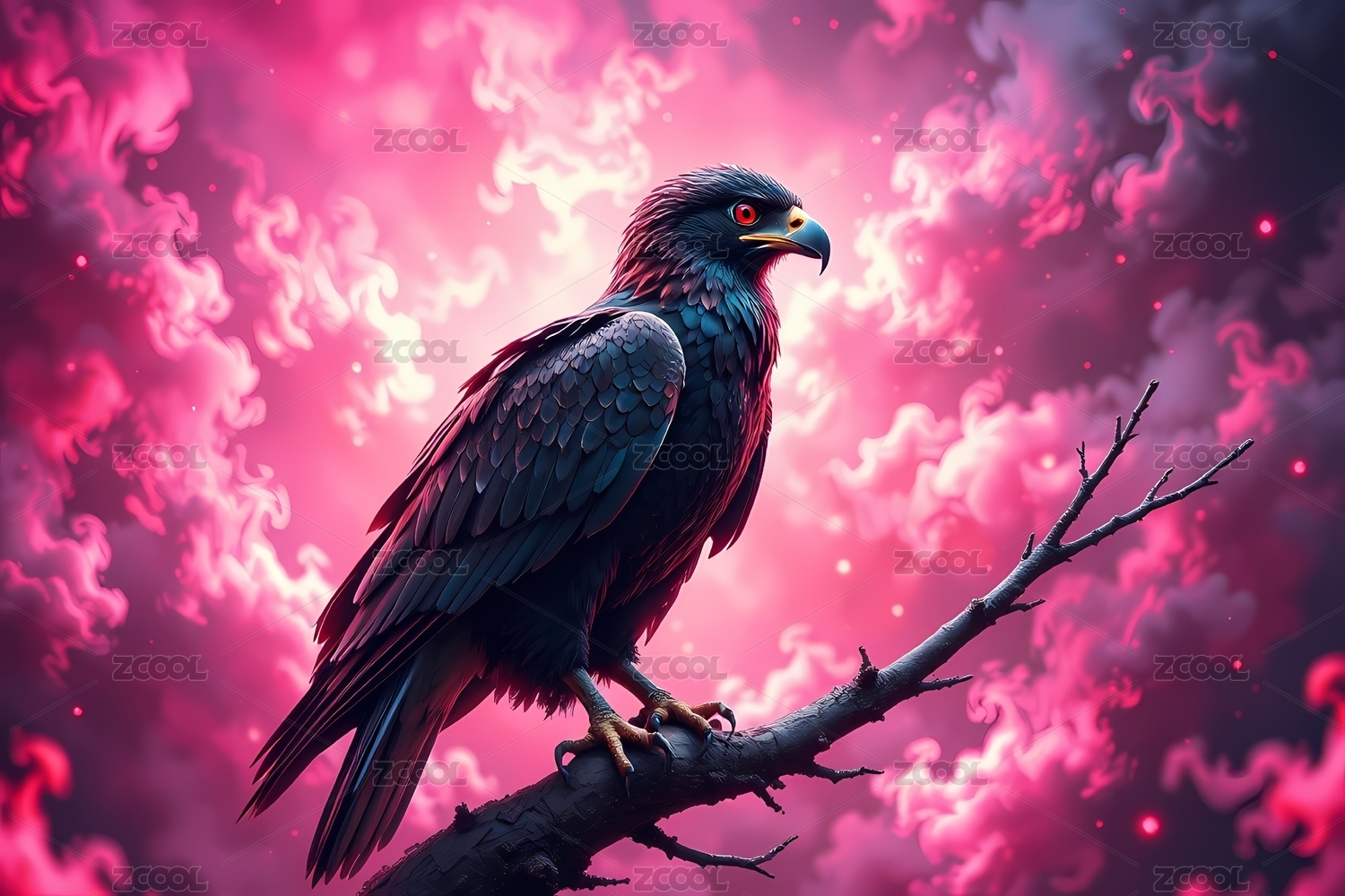 黑鹰立于枝桠背景梦幻绚丽