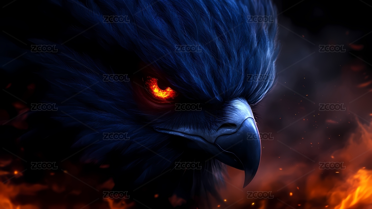 红眼蓝羽鹰凝视火焰背景
