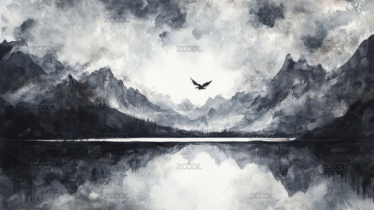 黑鹰翱翔于高山湖泊间的水墨画卷