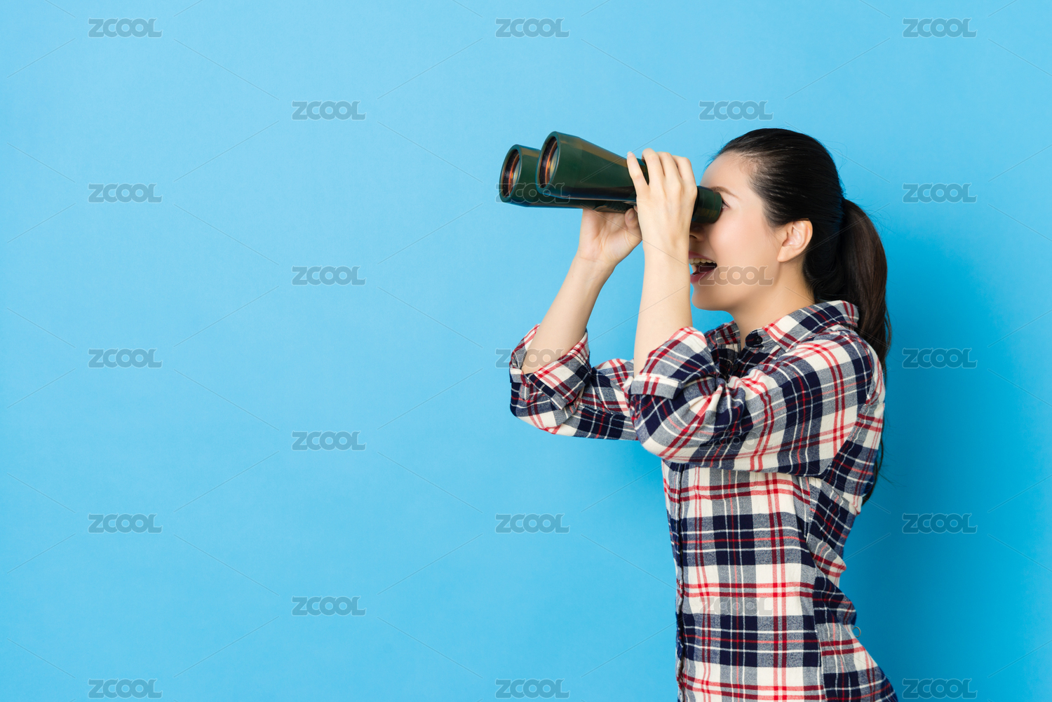 幸福美少女玩的望远镜感觉侧视图照片上蓝色背景搞笑隔离。