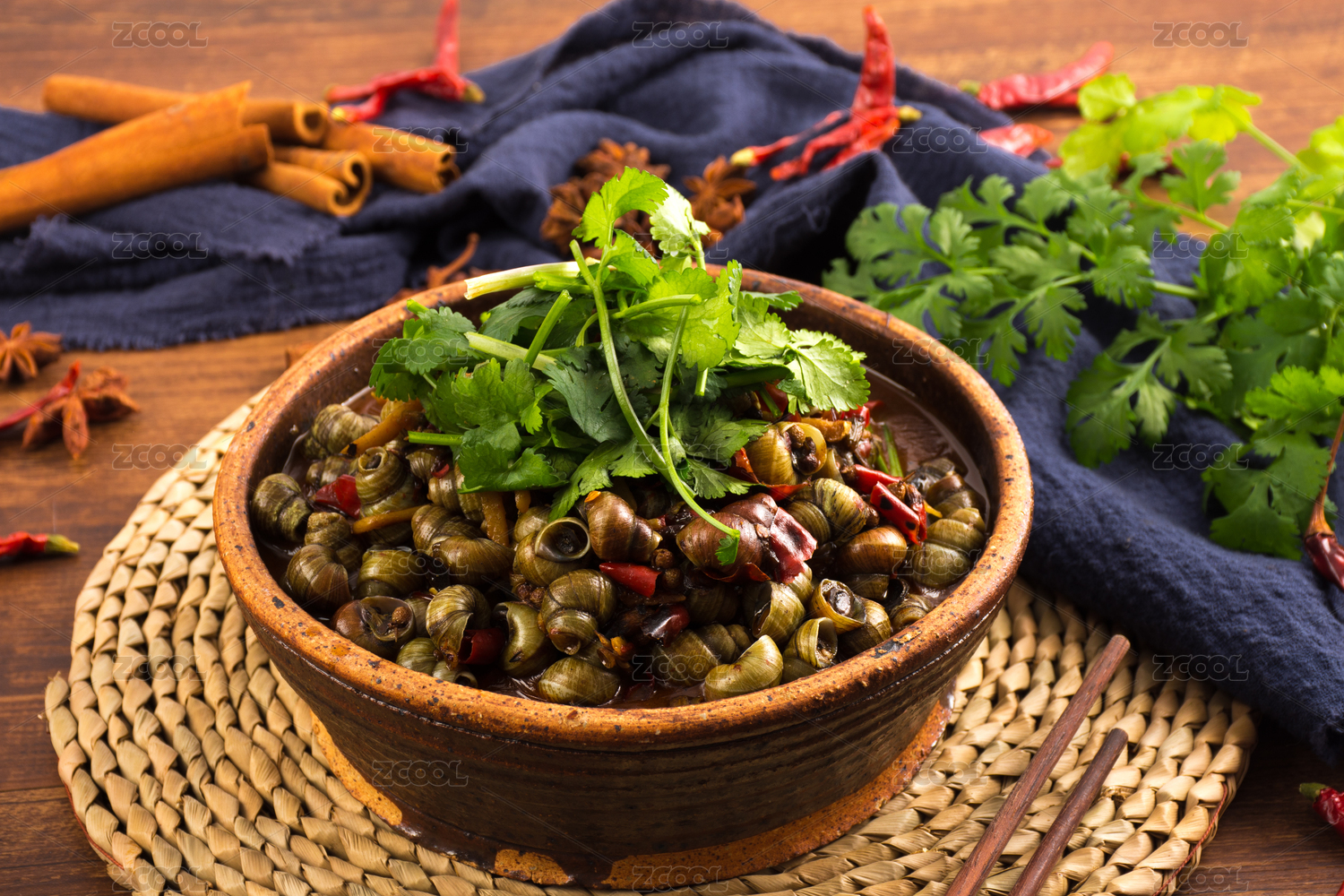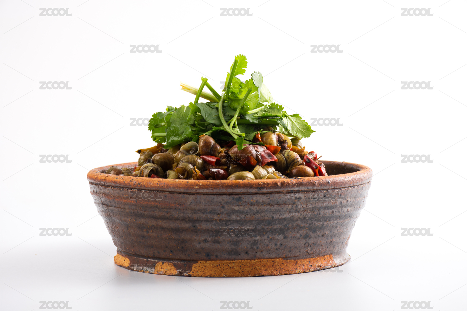 复古碗装着一大碗麻辣螺丝放在白色背景上
