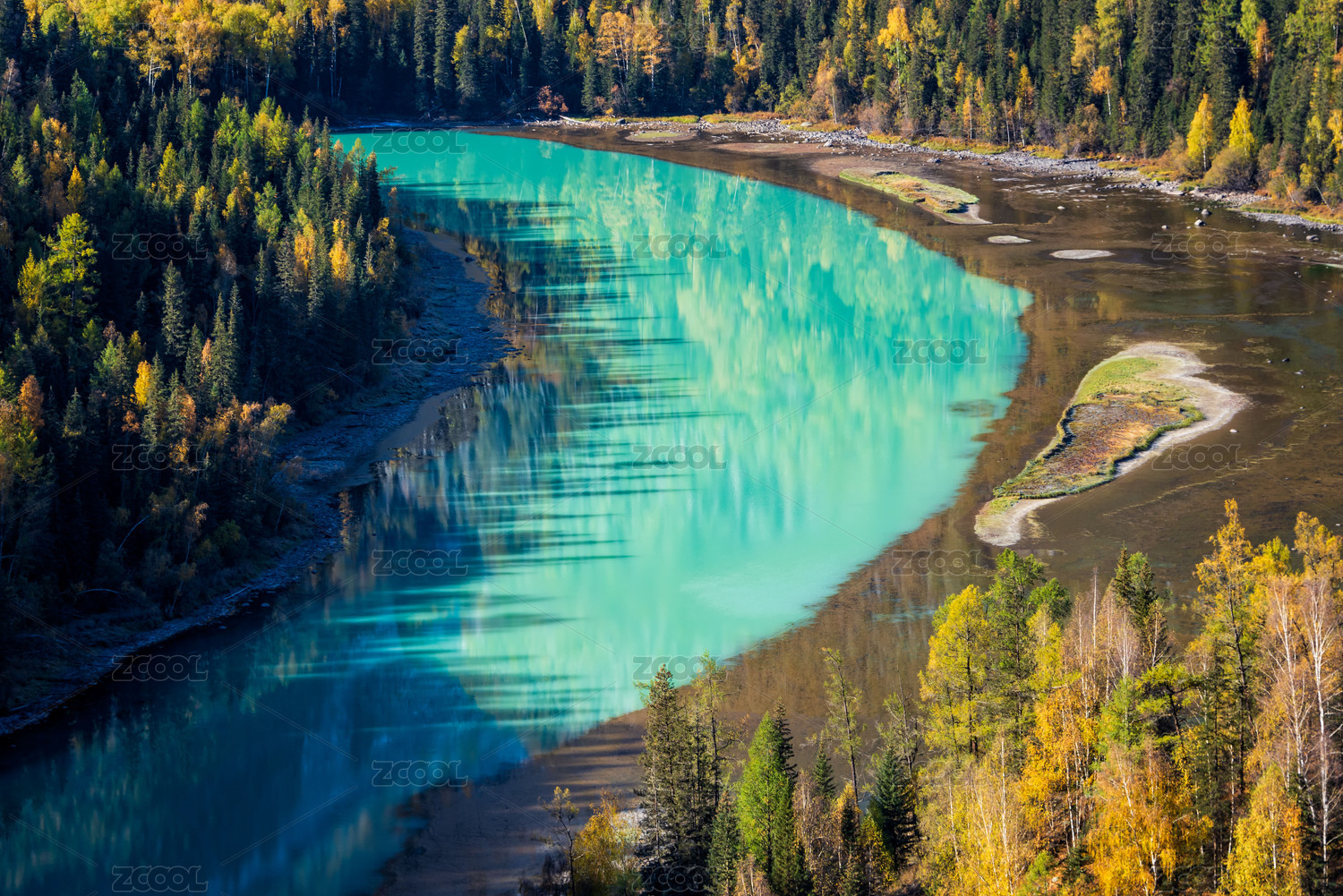 中国新疆阿勒泰布尔津喀纳斯月亮湾秋天风光