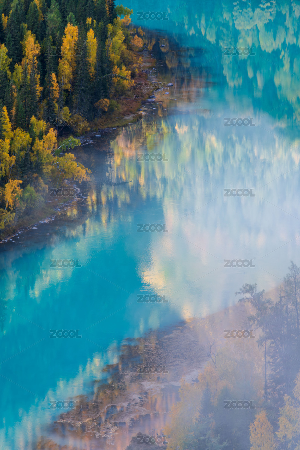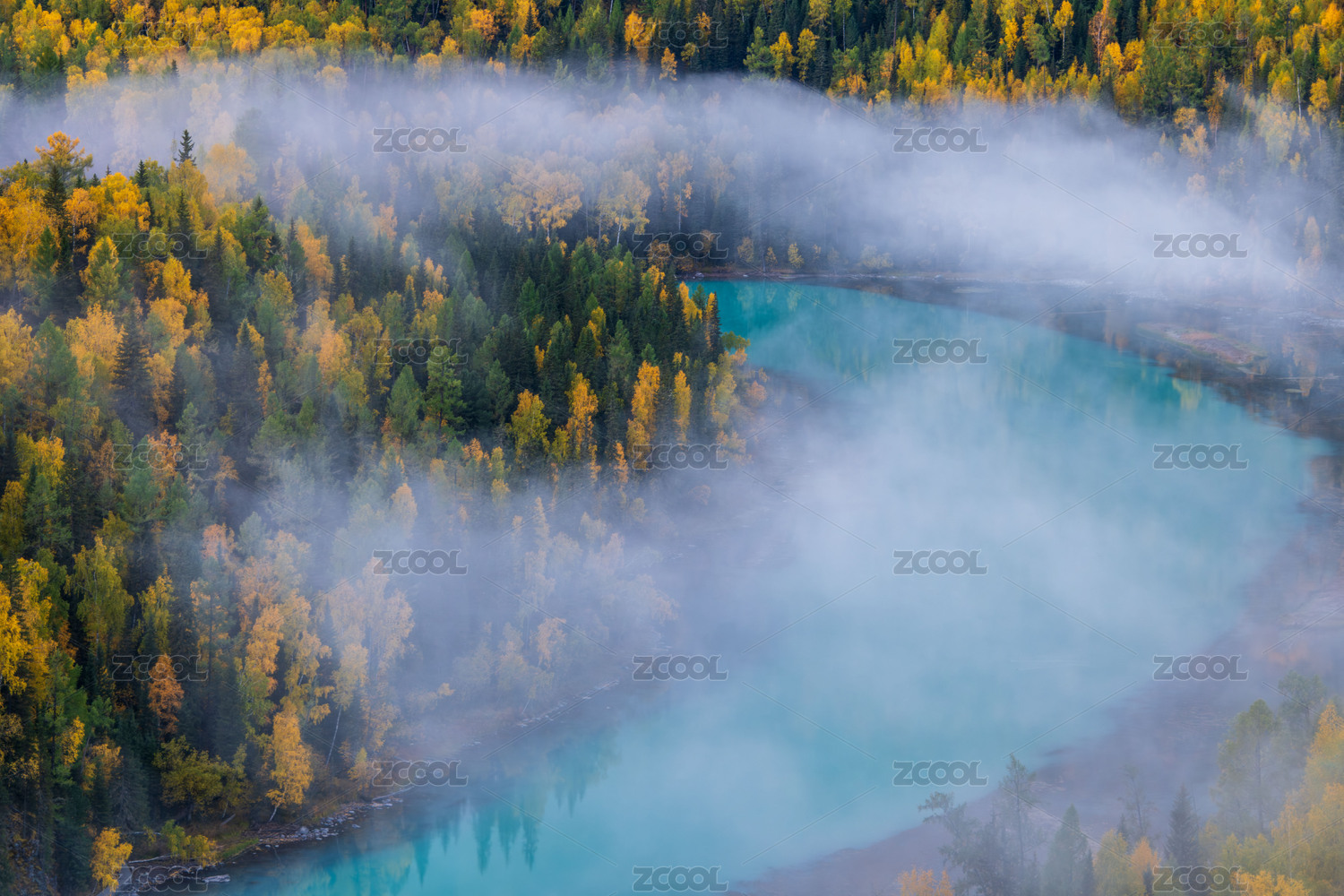 中国新疆阿勒泰喀纳斯月亮湾秋季晨雾风光