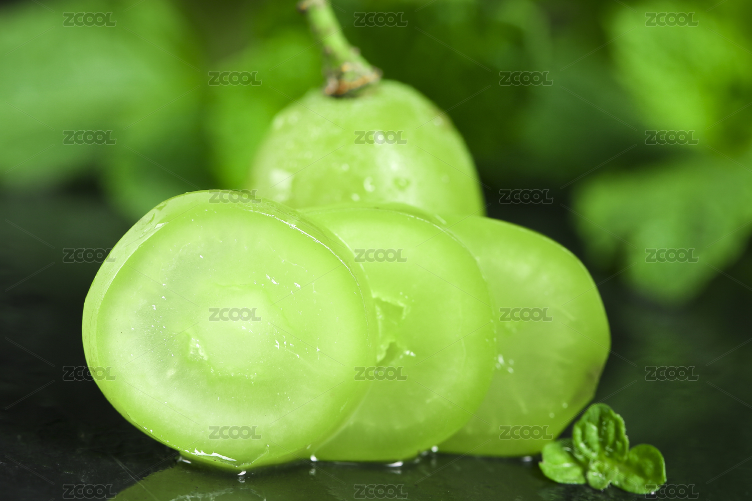 浅蓝底上放着一盘青葡萄柚和切面的西柚