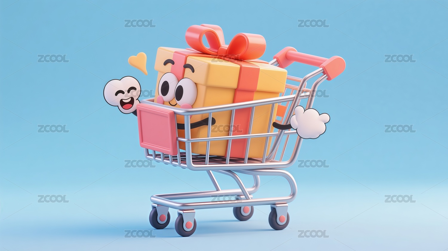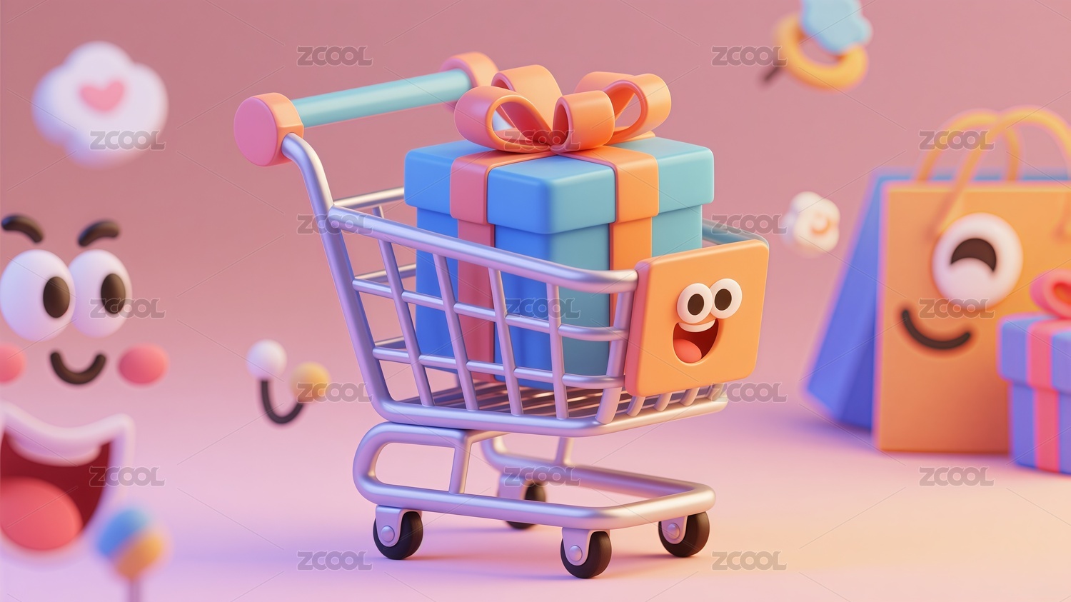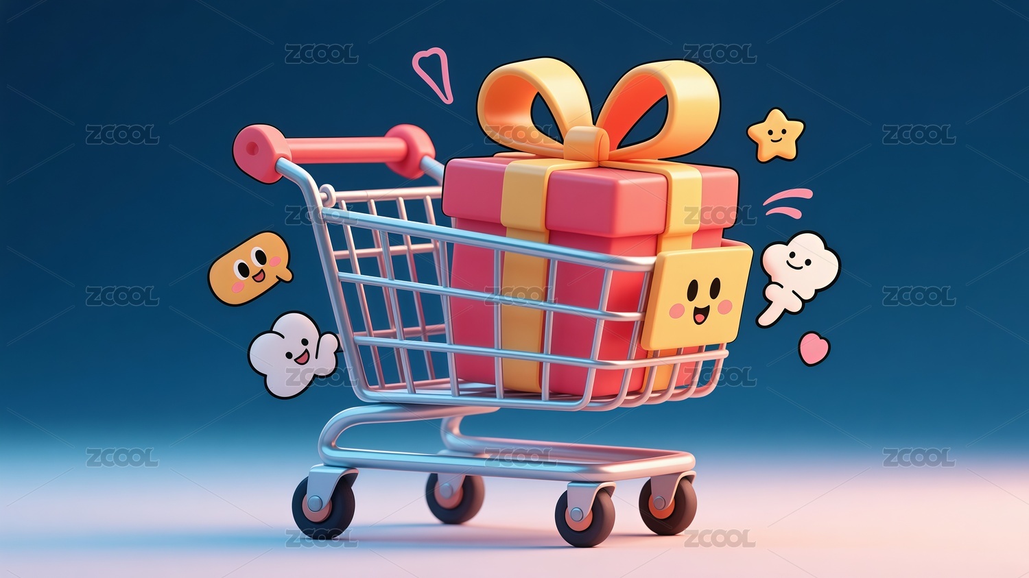 3D卡通风格购物车与礼盒场景插画