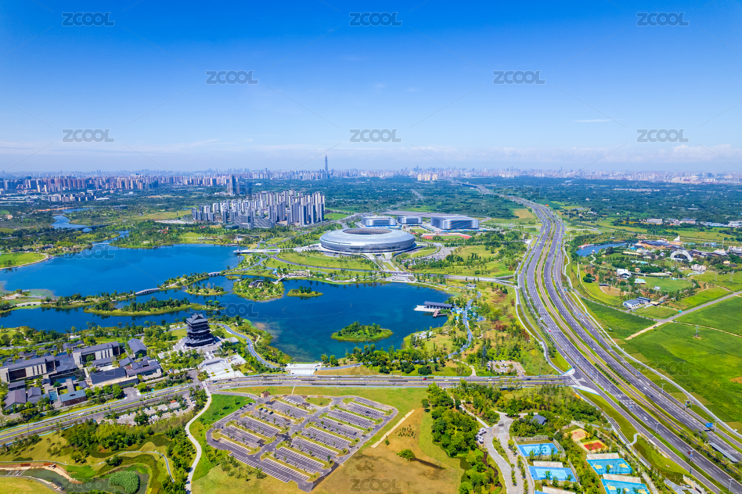 航拍四川省成都市龙泉驿区东安湖体育公园