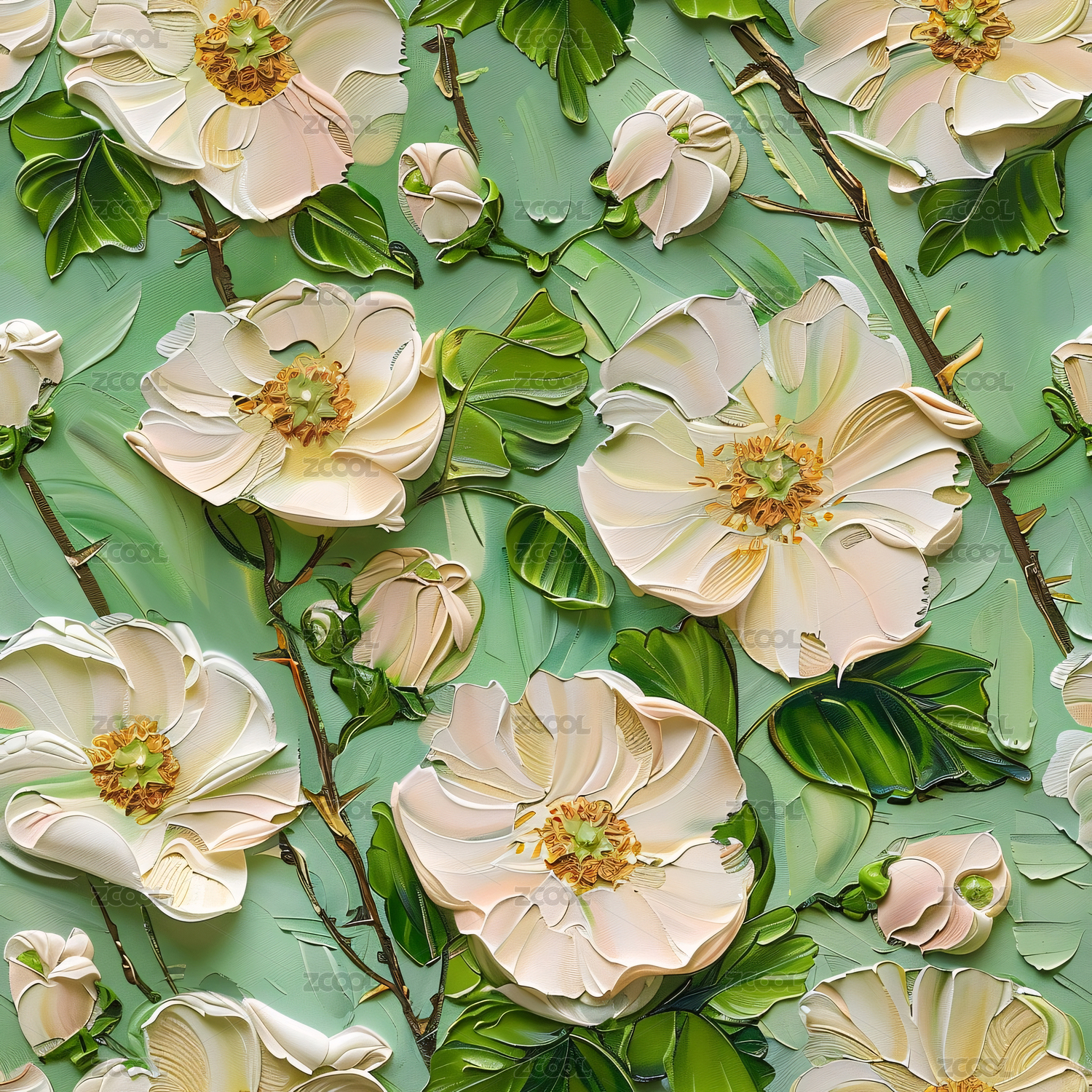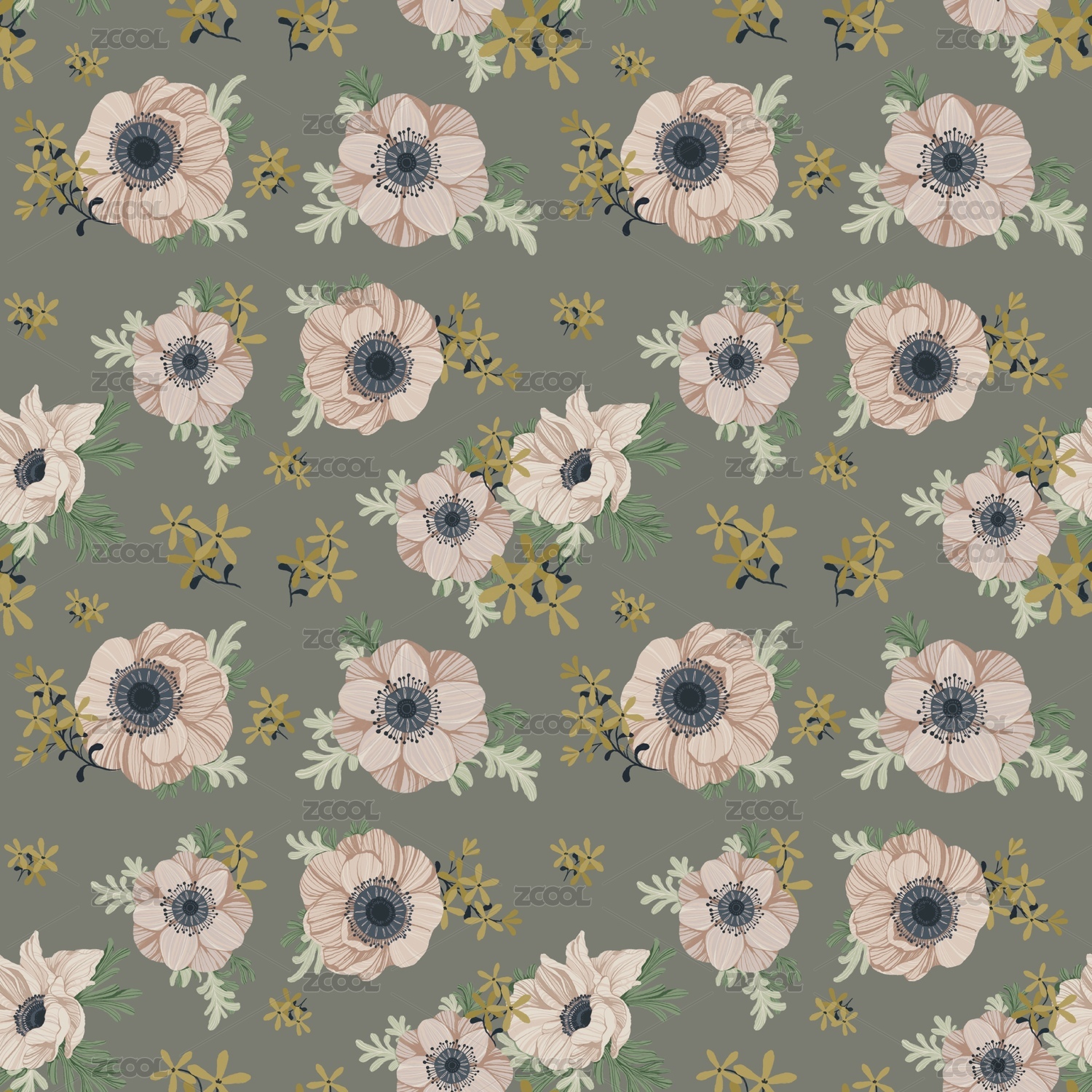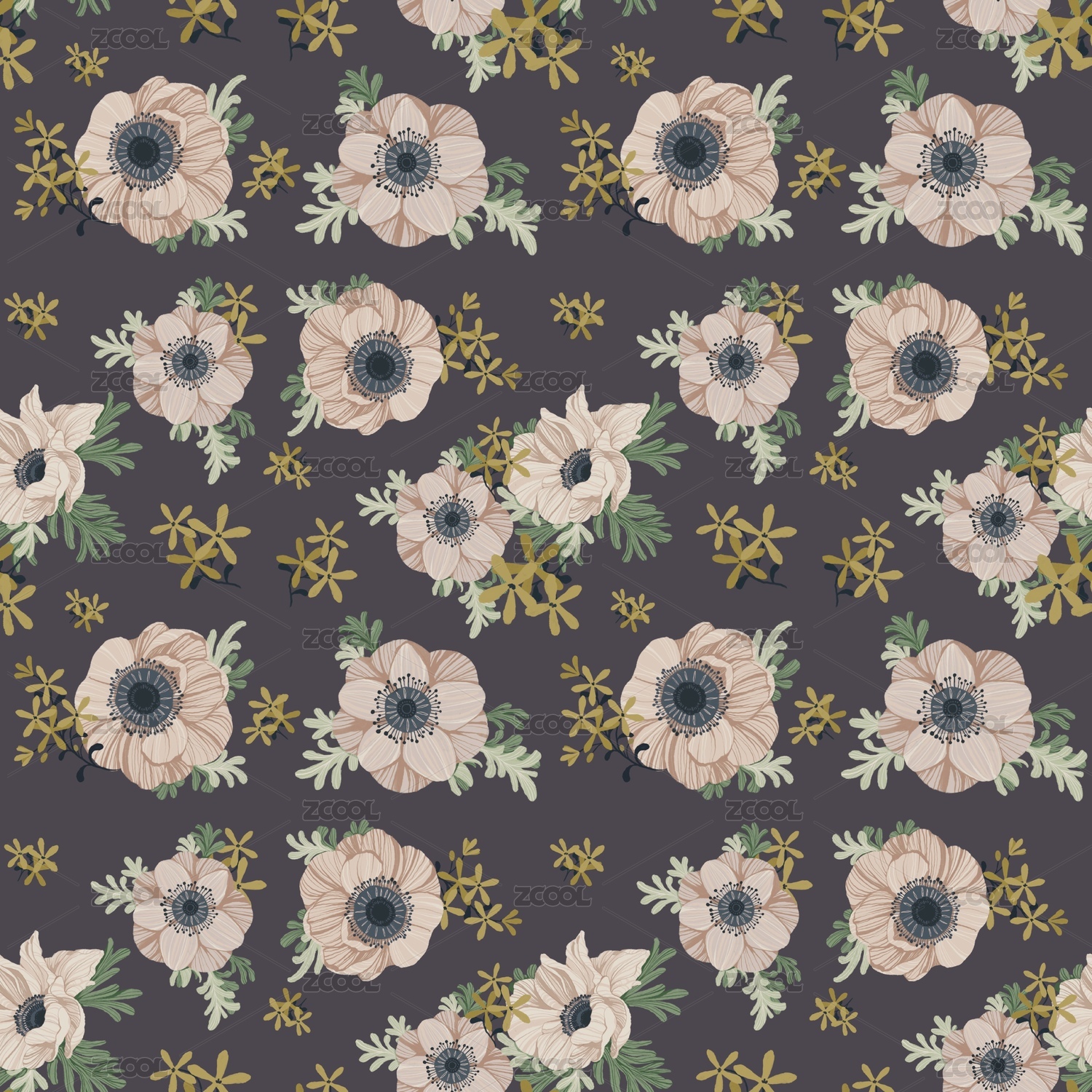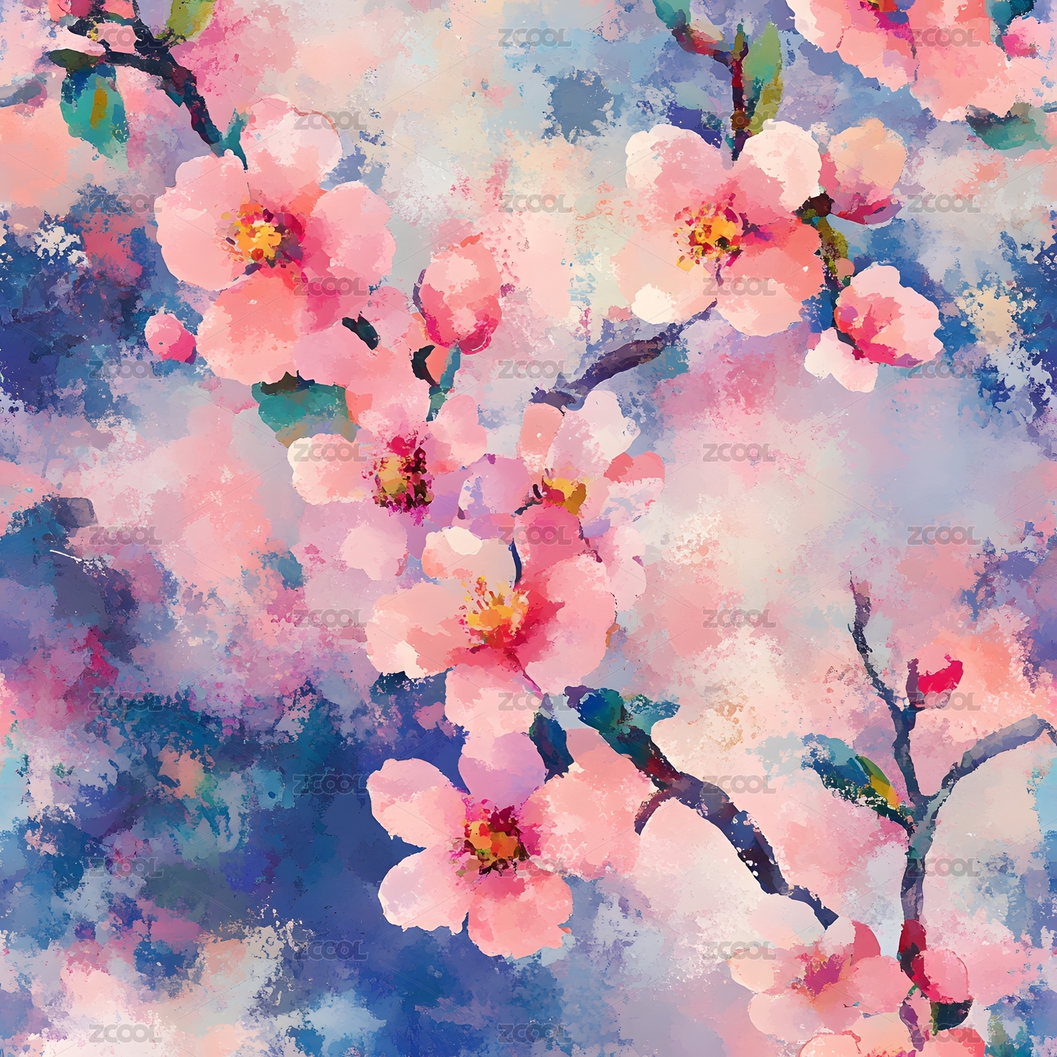 蓝色背景油画风格盛开桃花四方连续家纺图案