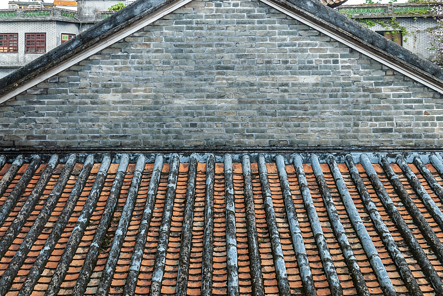 中国广东省东莞市可园古建筑砖墙和瓦片屋顶特写