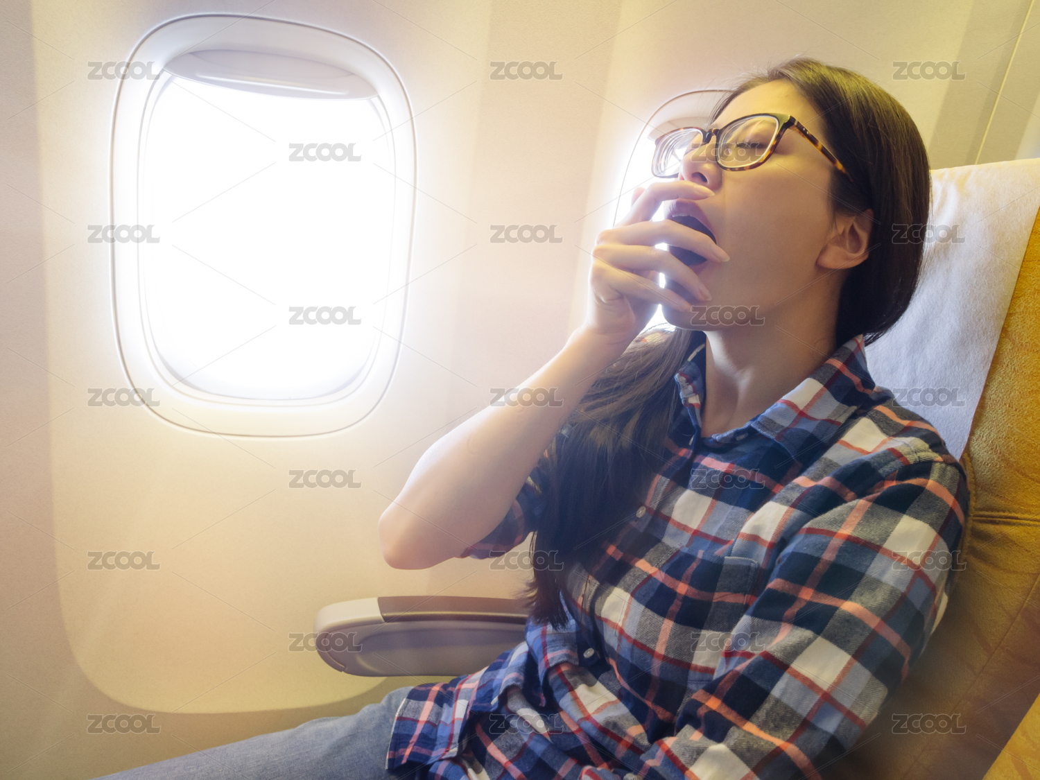 美丽的年轻女乘客采取在早上感觉很累,显示打哈欠冒充的航班要在飞机上睡觉。