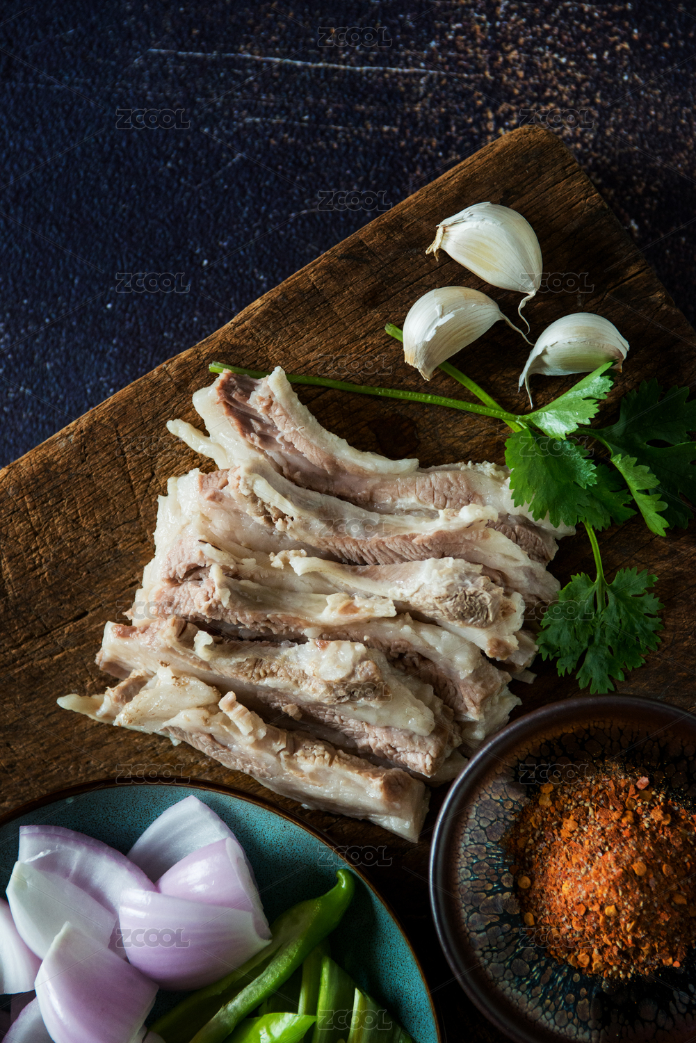 木盘子里有一份煮熟的手把肉