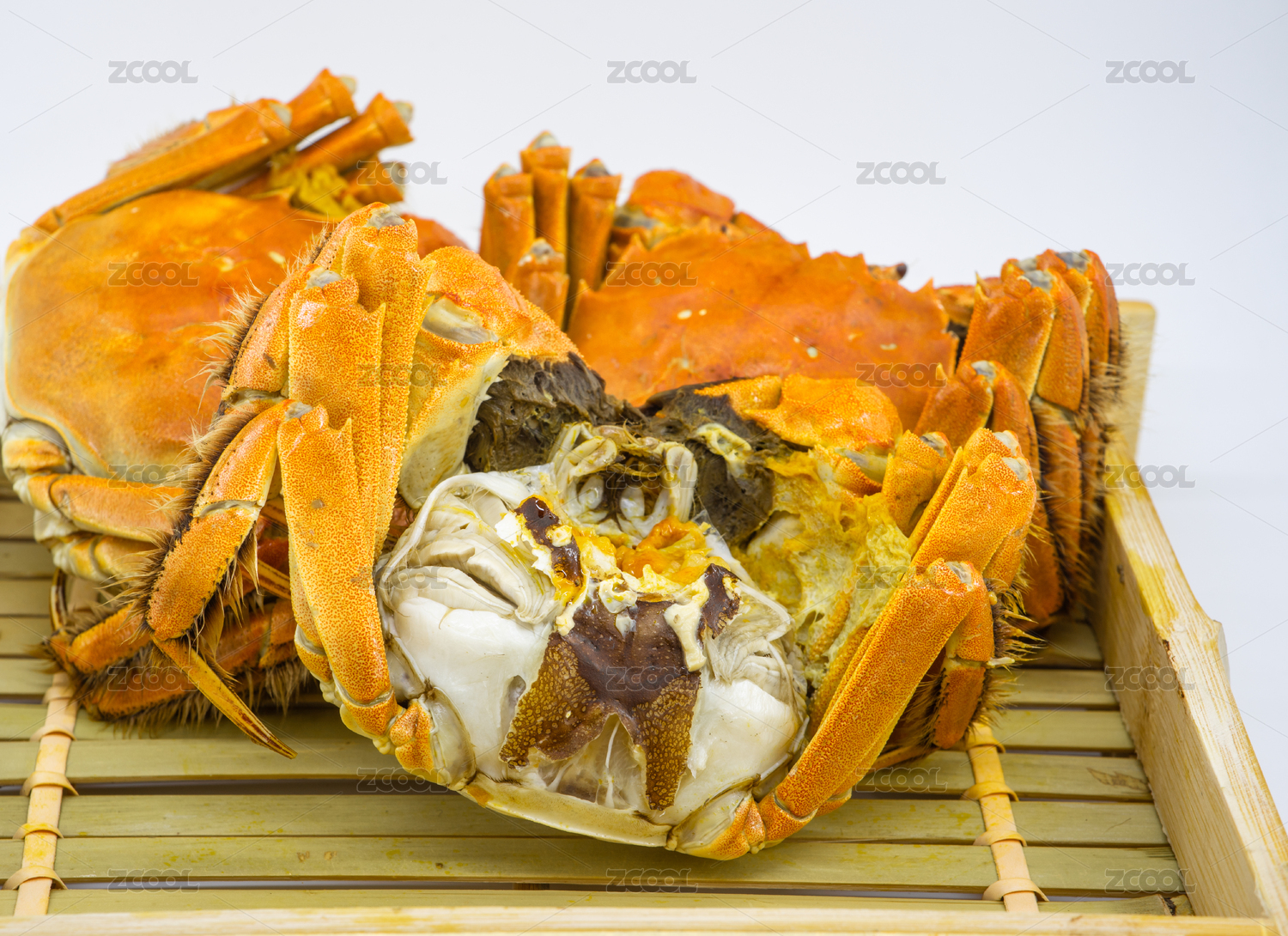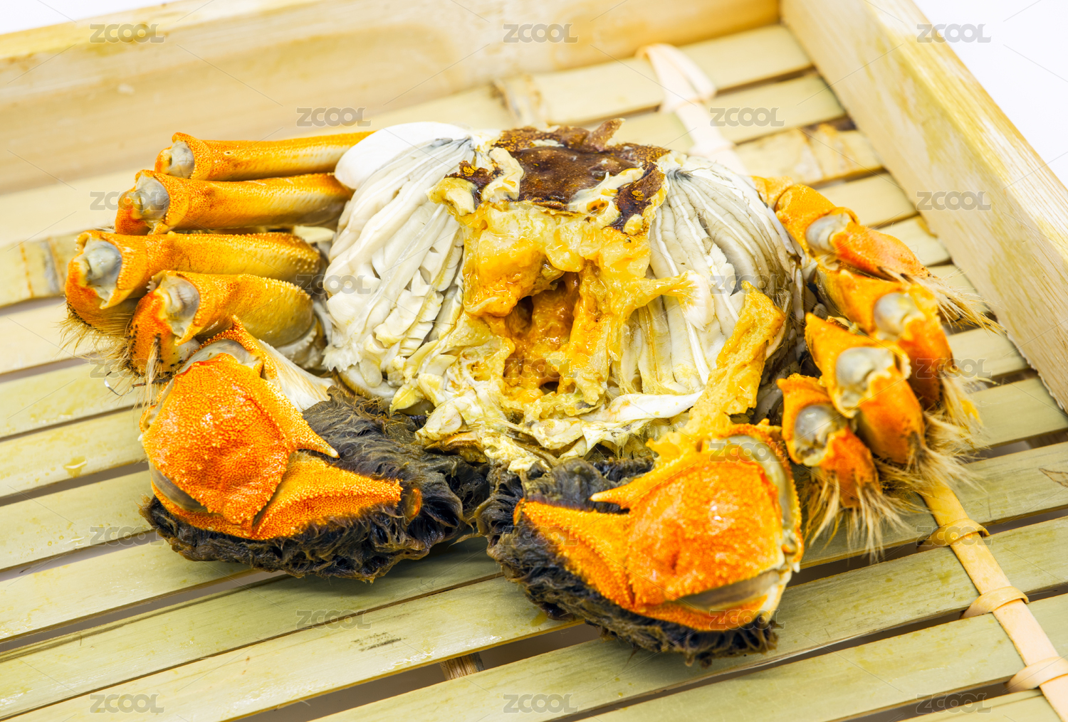 白色背景木质蒸笼里蒸熟剥开的大闸蟹蟹肉蟹黄蟹膏特写